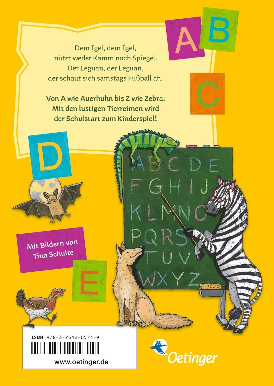 | Schlagworte | 1. Klasse • 1. Klasser • Alphabet • einfacher Wortschatz • Einschulung • Einschulung Junge • Erstes Lesen • Erstklässler • Grundschule • Kinderbücher ab 6 Jahre • Kindergarten • Leseanfänger • Lesen lernen • Lustige Reime • Schulanfang • Schultüte • Schultüte Füllung • Tierwelt • Vorschule • zoo |