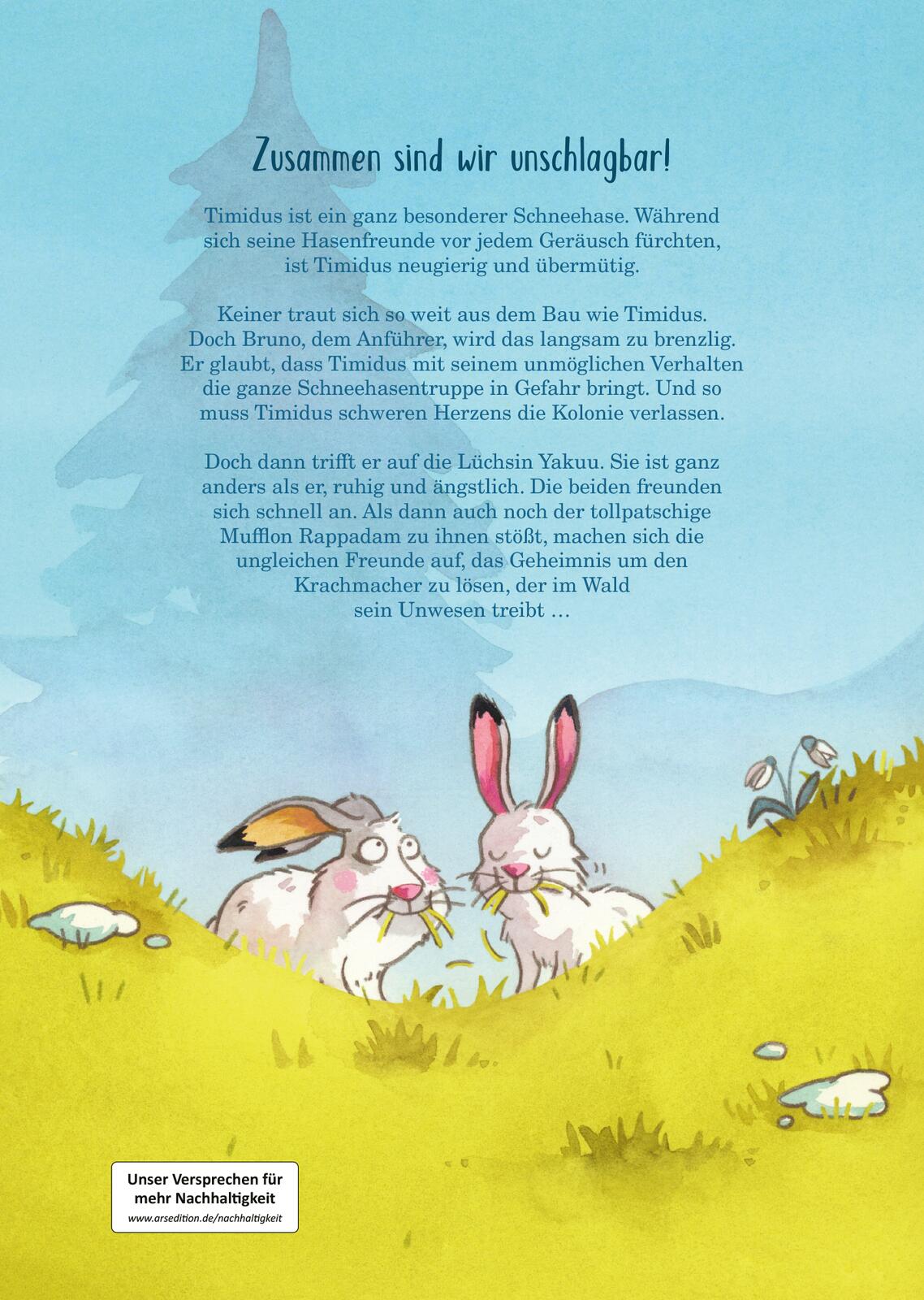 Anfangs macht ihm das auch noch viel Spaß. Timidus kann endlich selbst entscheiden, wie er leben möchte, und muss auf niemanden hören. Doch dann wird es recht schnell ziemlich einsam in seinem neu errichteten Bau. Gut, dass er auf die Lüchsin Yakuu trifft. Sie ist ganz anders als er. Ruhig und sehr vorsichtig, ja vielleicht sogar ein bisschen ängstlich. Also, keine Gefahr für Timidus. Die beiden freunden sich schnell an. Als dann auch noch der tollpatschige Mufflon Rappadam zu ihnen stößt, machen sich die ungleichen Freunde bereit, das Geheimnis um den Krachmacher zu lösen, der im Wald sein Unwesen treibt ...