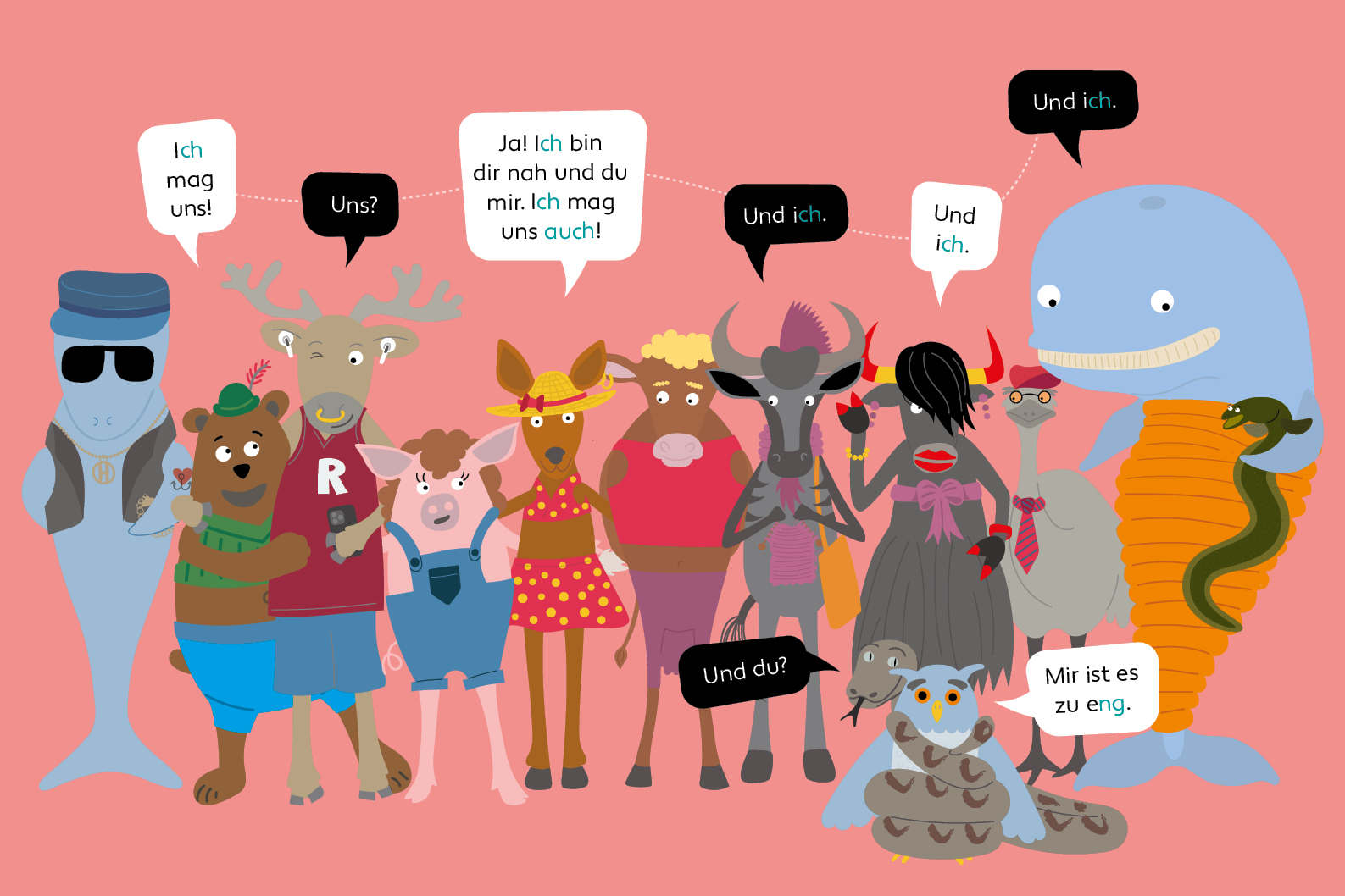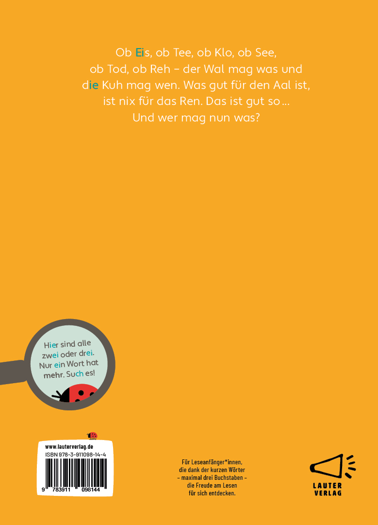 Als einfaches Comic mit kurzen und sich wiederholenden Texten und farbenfrohen Bildern regt dieses Buch zum Lesen an – die Texte können auch gut im Wechsel gelesen werden. Doch das Besondere: Das Buch kommt mit kurzen Wörtern aus (max. 3 Buchstaben). Dass das funktioniert, zeigt diese charmante Geschichte. Geeignet für Vorschulkinder bzw. Kinder, die die ersten Buchstaben für sich entdeckt haben.