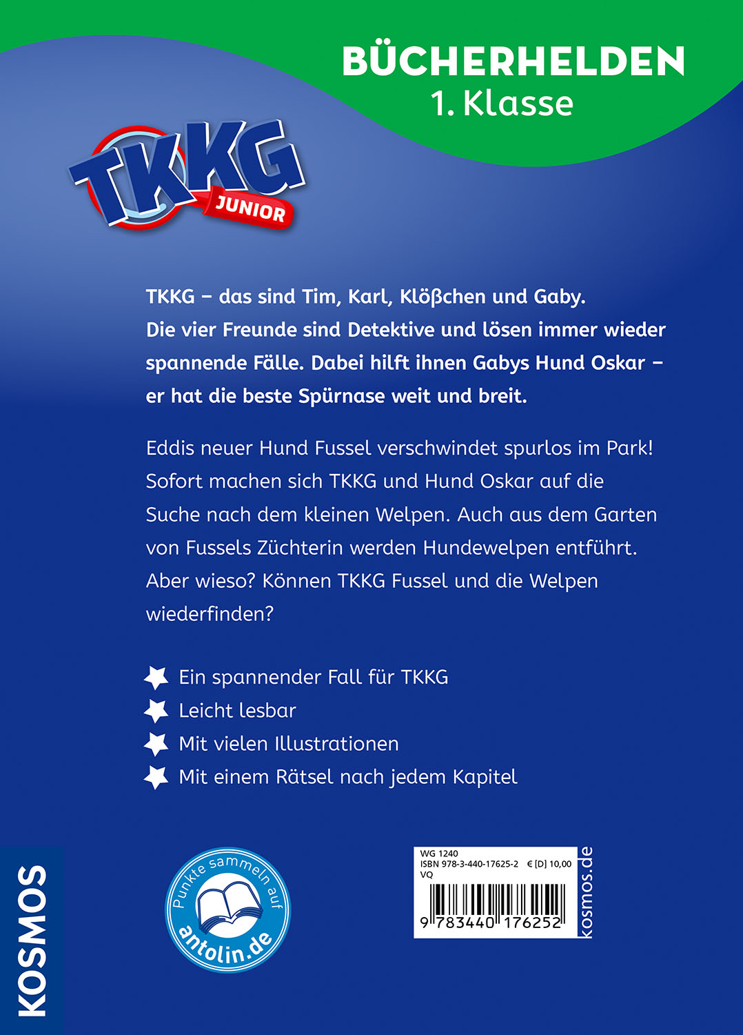 Oh, nein – Fussel ist verschwunden! Tim, Karl, Klößchen und Gaby lernen den niedlichen Welpen und seine kleinen Geschwister kennen. Als Fussel plötzlich weg ist nehmen TKKG die Ermittlungen auf. Wer steckt dahinter? Wurde der Welpe entführt? Gabys Hund Oskar hat die beste Spürnase und unterstützt die Detektive bei diesem Fall besonders gut. Ein turbulenter Bücherhelden-Band für Erstleser. In acht Kapitel ist auch ihr detektivisches Können gefragt: Das spannende Abenteuer lesen und am Ende jedes Kapitels ein Leserätsel lösen. Mit einfacher Fibelschrift und niedlichen Hunde-Illustrationen.
