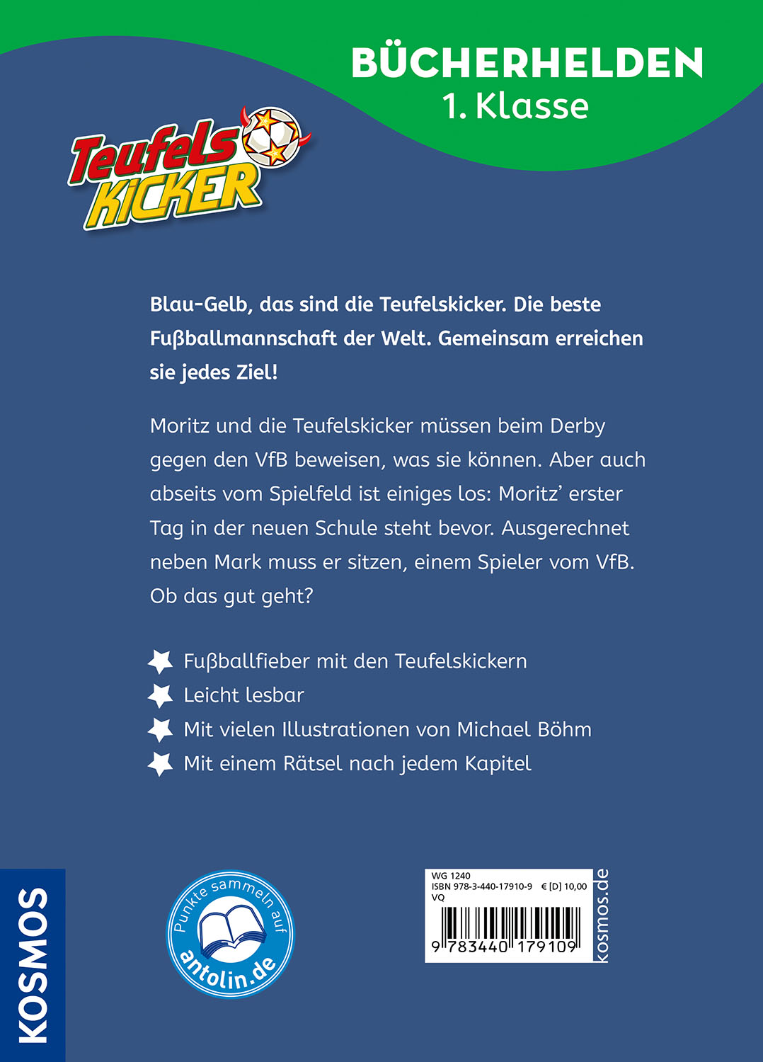 Bald ist es endlich soweit! Moritz spielt das erste Spiel mit seinem neuen Team, den Teufelskickern Mehmet, Catrina, Niko und Enes. Doch muss es ausgerechnet das Derby gegen seinen Erzrivalen VfB sein? Und vor allem: Können die Freunde das Spiel gewinnen? Zur gleichen Zeit ist auch in der Schule ganz schön viel los. Teufelskicker Moritz hat viel vor! Wird er das alles schaffen? Lesen lernen und mitfiebern: Eine interaktive Geschichte in sechs Kapiteln und mit vielen Illustrationen in der Reihe Bücherhelden. Nach jedem Kapitel lösen Erstleser ein Leserätsel und unterstützen die Teufelskicker bei ihren Plänen.