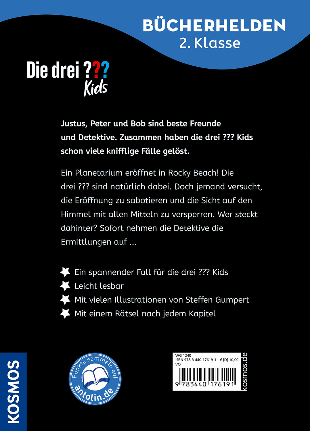 Rocky Beach hat ein Planetarium! Justus, Peter und Bob sind bei der Eröffnung dabei und freuen sich auf die Vorführungen. Doch statt des klaren Sternenhimmels gibt es nur Nebel und beim Sternenprojektor gehen die Lichter aus. Ups. Alles Zufall? Die drei ??? glauben nicht daran. Wer sabotiert denn eine Eröffnung? Wer möchte der Leiterin des Planetariums schaden? Ein interaktiver Fall zum Lesen lernen in der Reihe Bücherhelden. Mit vielen coolen Illustrationen und Leserätseln nach jedem Kapitel. Lesen, mitfiebern und gemeinsam mit den drei ??? Verdächtige befragen, Spuren suchen und Beweise sichern.