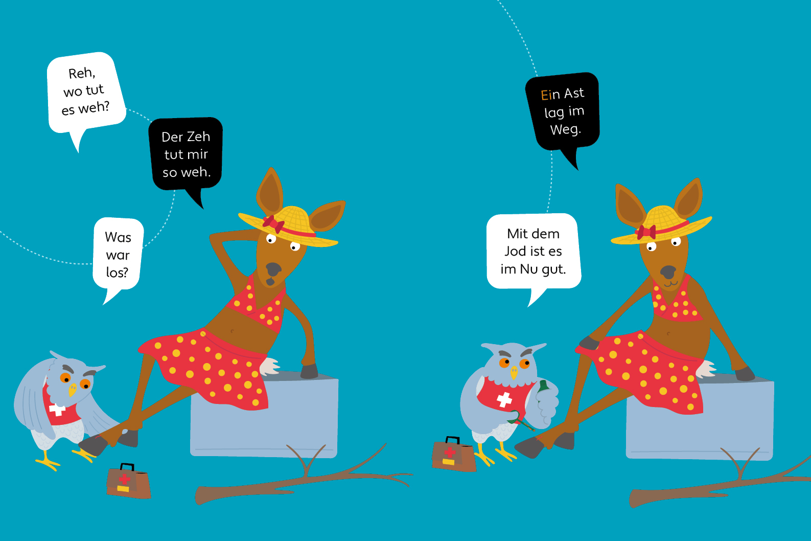 Gnu, wo tut es weh? – Der Huf tut mir weh. – Was war los? – Der Bus gab Gas. – Mit dem Bad ist es im Nu gut.