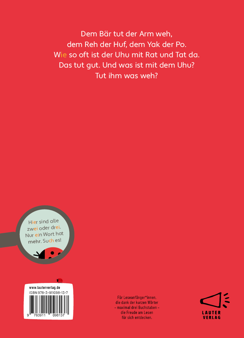 Als einfaches Comic mit kurzen und sich wiederholenden Texten und farbenfrohen Bildern regt dieses Buch zum Lesen an – die Texte können auch gut im Wechsel gelesen werden. Doch das Besondere: Das Buch kommt mit kurzen Wörtern aus (max. 3 Buchstaben). Dass das funktioniert, zeigt diese charmante Geschichte. Geeignet für Vorschulkinder bzw. Kinder, die die ersten Buchstaben für sich entdeckt haben.