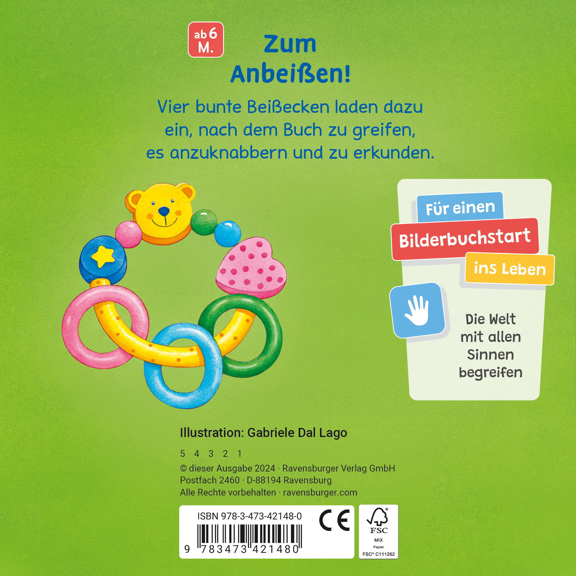 1, 2, 3 und losgeknabbert! Dieses Buch haben Babys zum Fressen gern! Denn vier farbenfrohe Beißecken wecken die Entdeckerlust von Kindern ab 6 Monaten. In diesem Alter wird gern alles in den Mund genommen. Deshalb sind die genoppten Kunststoffecken beim Knabbern, Kauen und Beißen besonders spannend für Babys, ganz besonders, wenn dann auch noch die ersten Zähne kommen. Die Beißecken sind extrastabil, abwaschbar und aus unbedenklichen Materialien. Mit diesem Buch darf geknabbert, gelutscht und gekaut werden. Die Ecken sind extra für Babys entwickelt worden, damit sie dieses Buch mit allen Sinnen erforschen können. Denn Babys entdecken in diesem Alter vor allem mit dem Mund! Teddybär, Banane, Mond oder Kuschelmaus: beim Betrachten der farbenfrohen Bilder schulen die Kleinen spielerisch ihre Wahrnehmung und lernen ganz nebenbei Sprechen.
