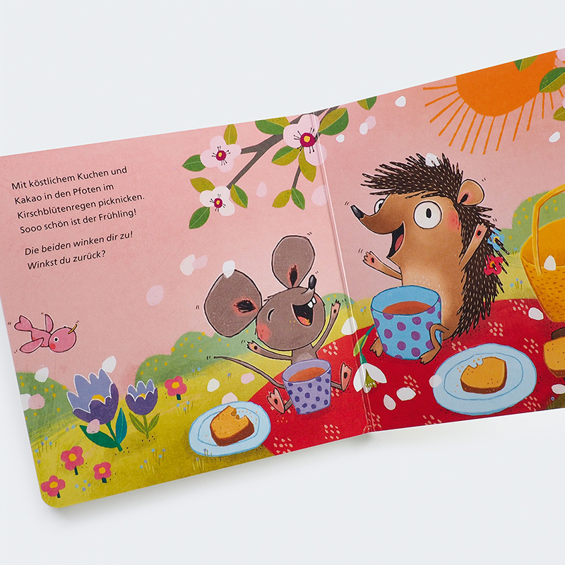 Eine interaktive, fröhliche und bunte Pappbilderbuch-Reihe, bei der Kinder die Jahreszeiten erleben können, indem sie fleißig mitmachen: Im Frühling, wenn den Igel die ersten Sonnenstrahlen aus dem Winterschlaf kitzeln, können sich kleine Leser:innen gemeinsam mit ihm recken und strecken und zur Begrüßung des Frühlings vor Freude hüpfen. Dann mit den Vögeln ein Liedchen trällern, beim Frühjahrsputz Laub wegfegen, Regenwolken wegpusten, Eier suchen und mit der Maus einen köstlichen Teig für den Kuchen anrühren. Einmal in die Hände klatschen – schon ist er fertig!