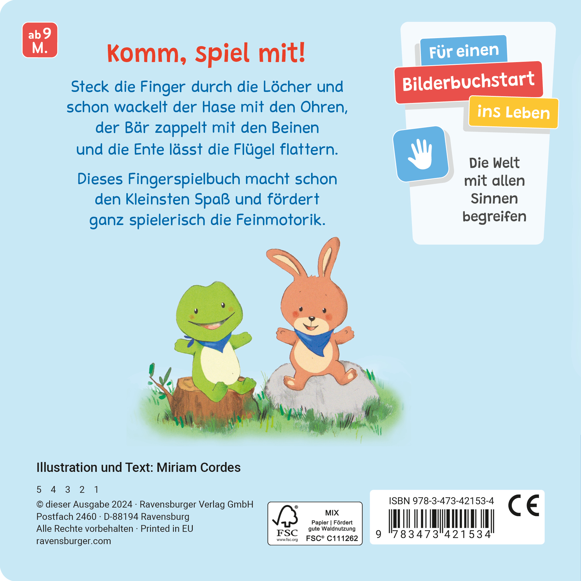 Ein lustiges Fingerspielbuch mit ersten Reimen Hier gibt es ein witziges Gewackel und Gezappel! Einfach die Finger durch die Löcher stecken und schon werden die Figuren lebendig: Pelle, der Hase, wackelt mit den Ohren, Butz, der Bär, zappelt mit den Beinen und Ente Emil hat lustige Watschelfüße. Ein Fingerspielbuch, das schon Kleinkindern ab 9 Monaten Spaß macht und spielerisch die Feinmotorik fördert. Liebevolle, kurze Reime animieren zusätzlich zum Sprechen lernen. Fingerspielbücher begeistern schon Kleinkinder ab 9 Monaten: Auf jeder Seite befinden sich Löcher, durch die die Finger gesteckt werden. So werden die Figuren zum Leben erweckt: Locke, das Schaf, wedelt mit dem Schwänzchen, Emil, die Ente, flattert mit den Flügeln. Und was macht Frida, der Frosch? Auf jeder Seite ist richtig viel los: Kinder haben großen Spaß an den zappelnden Fingern, sehen ganz genau hin und schulen so ihre Wahrnehmung. Hier werden Babys zu Bücherfans: Fröhliche Bilder, einfaches, lustiges Spielprinzip und kindgerechte Reime. Dieses Buch von Ravensburger fördert spielerisch die Feinmotorik und unterstützt Kleinkinder beim Spracherwerb.