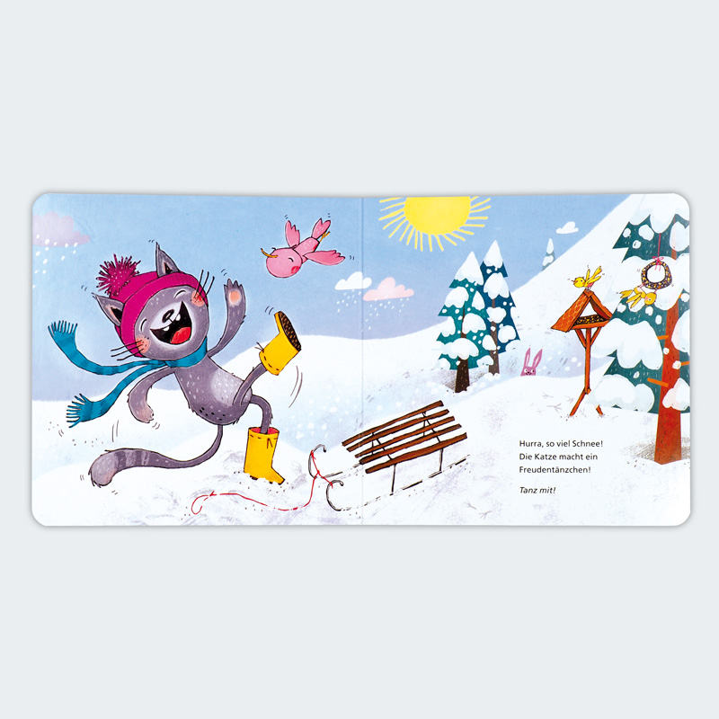 Eine interaktive, fröhliche und bunte Pappbilderbuch-Reihe, bei der Kinder die Jahreszeiten erleben können, indem sie fleißig mitmachen: Im Winter geht es mit Katze und Uhu zum Schlittenfahren. Aber erst mal vorsichtig anklopfen und sie wachkitzeln – die Katze schläft ja noch. Dann Mütze und Schal suchen, los geht’s. Ein Tänzchen im Schnee, bevor man den Schlitten den Berg hochschiebt, den Schnee beiseitepustet und das Buch dreht, um die Tanne vom Schnee zu befreien. Bei warmer Suppe und Kerzenlicht winken Katze und Uhu den Kindern zu. Bitte zurückwinken!
