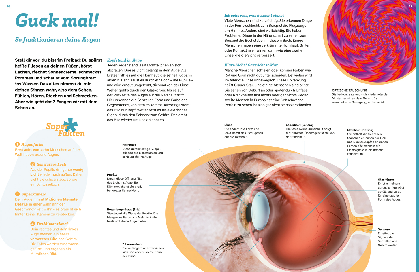 Magensäure kann Metall auflösen, Speichel enthält ein Schmerzmittel und unsere Blutgefäße passen aneinandergereiht einmal um die Erde. Der Körper ist ein Wunderwerk und funktioniert nur durch Teamwork von Auge bis Zeh. Aber wie spielen die Billionen Zellen zusammen? Um das herauszufinden, gehen die Leserinnen und Leser auf eine atemberaubende Reise in unser Innerstes. Sie fallen mit einem Lichtstrahl ins Auge ein und schwimmen mit Blutkörperchen durch Gefäße. Dabei erfahren sie, wie Zellen aufgebaut sind, welche Rolle rote und weiße Blutkörperchen spielen und warum ein Körper auch mal krank werden kann. Nur wer seinen Körper kennt, kann ihn auch gesund halten. Ein spannendes Sachbuch mit verblüffenden Fakten für Kinder ab 8 Jahren.