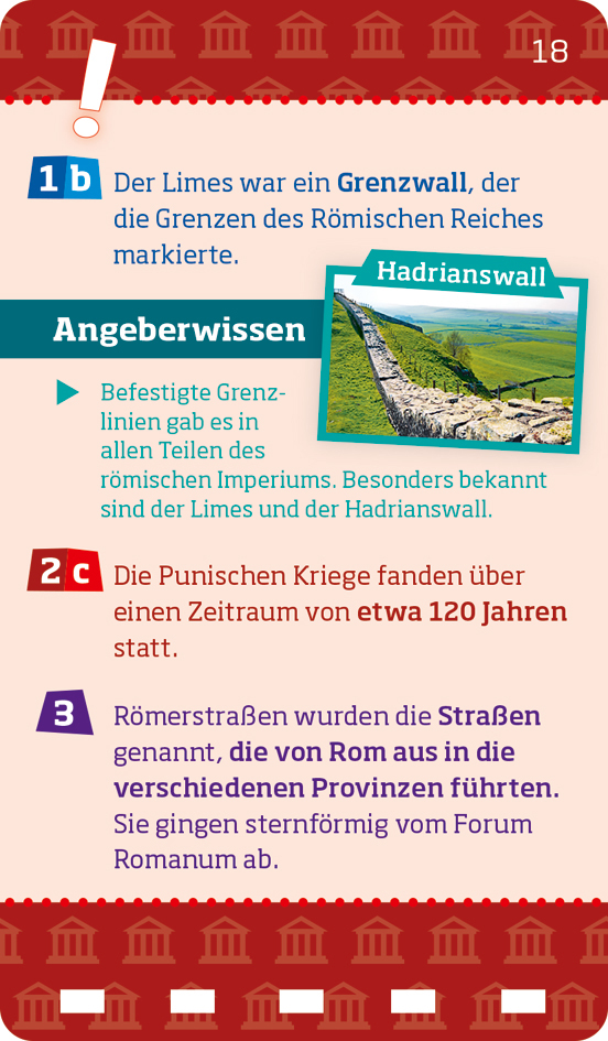 | Schlagworte | Aquädukt • Asterix • Circus Maximus • Ewige Stadt • Forum Romanum • Frage-Antwort-Spiel • Götter • Göttinnen • Herrscher • Juno • Jupiter • Kolosseum • Minerva • Quiz-Block • Rätsel • Rom • Sieben Hügel • Tiber • Wissen |
