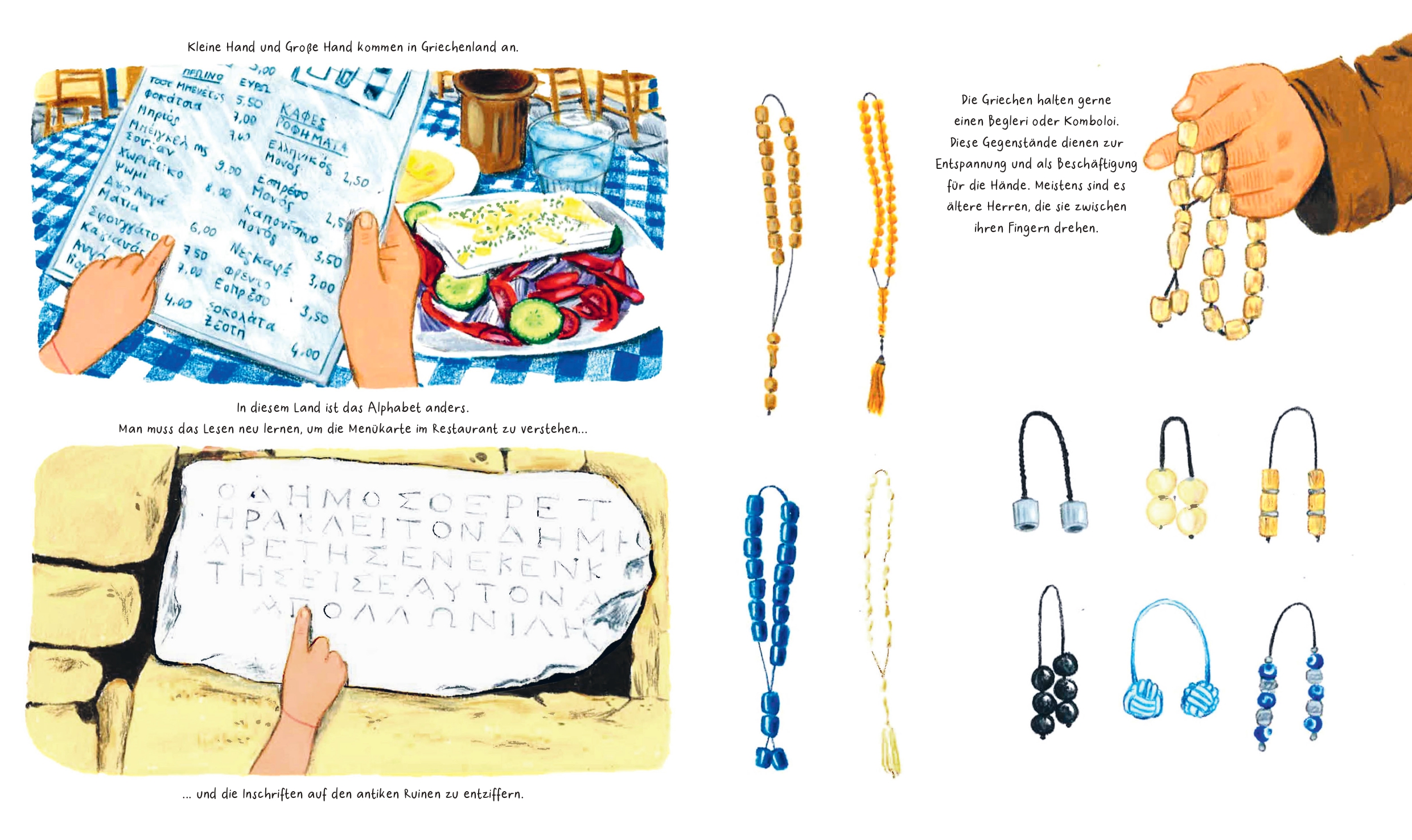 Dies ist die Geschichte einer kleinen Hand und einer großen Hand, die sich sehr lieb haben und sich gemeinsam auf eine Reise durch Europa machen. Kleine Hand und Große Hand durchqueren prächtige Landschaften und machen erstaunliche Begegnungen mit Kulturen, Religionen und Lebensweisen, die sie noch nicht kannten.Sie wussten davor zum Beispiel nicht, dass in einem italienischen Tal Französisch gesprochen wird oder dass es in Montenegro ein in den Fels gehauenes Kloster gibt, oder wie slowenisches Boccia gespielt wird oder dass man in der Türkei süßen Tee aus kleinen, länglichen Gläsern trinkt ...Unterwegs spielen sie miteinander, knüpfen Armbänder, halten sich fest, verlieren einander, finden sich wieder und bauen eine starke und vertrauensvolle Beziehung auf.Hand in Hand entdecken sie die Welt.