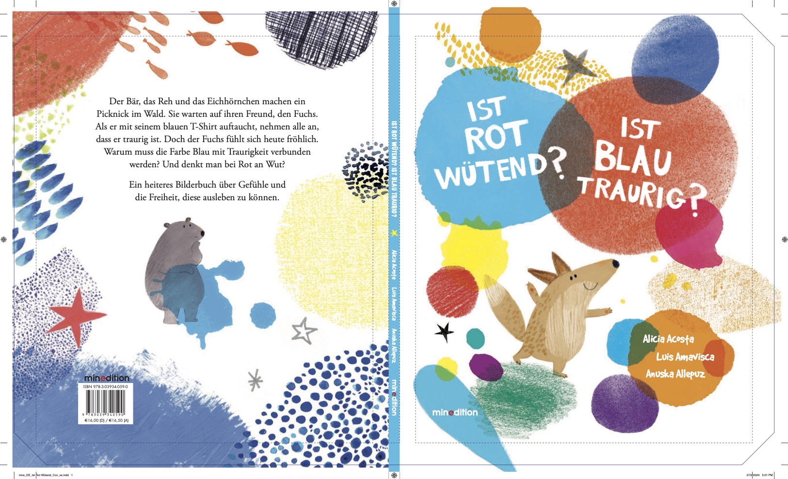 Der Bär, das Reh und das Eichhörnchen machen ein Picknick. Sie warten auf den Fuchs. Als er mit seinem blauen T-Shirt auftaucht, nehmen alle an, dass er traurig ist. Der Fuchs ist verwirrt - warum denken sie, dass er traurig ist? Er ist heute fröhlich. Warum muss Blau mit Traurigkeit verbunden werden? Und warum ist Rot mit Wut verbunden? Er möchte die Freiheit haben, alle Farben zu mögen und zu tragen!"Ich mag rote Äpfel, aber das heißt nicht, dass ich wütend bin! Und meine Lieblingsfarbe ist Blau, aber das heißt nicht, dass ich traurig bin.Und manchmal trage ich Gelb, auch wenn ich einen schlechten Tag habe."- Welche Gefühle werden mit welchen Farben verbunden? - Über Gefühle, Empfindungen und die Freiheit der Farben. - Ein Buch über Toleranz und Respekt vor dem anderen.