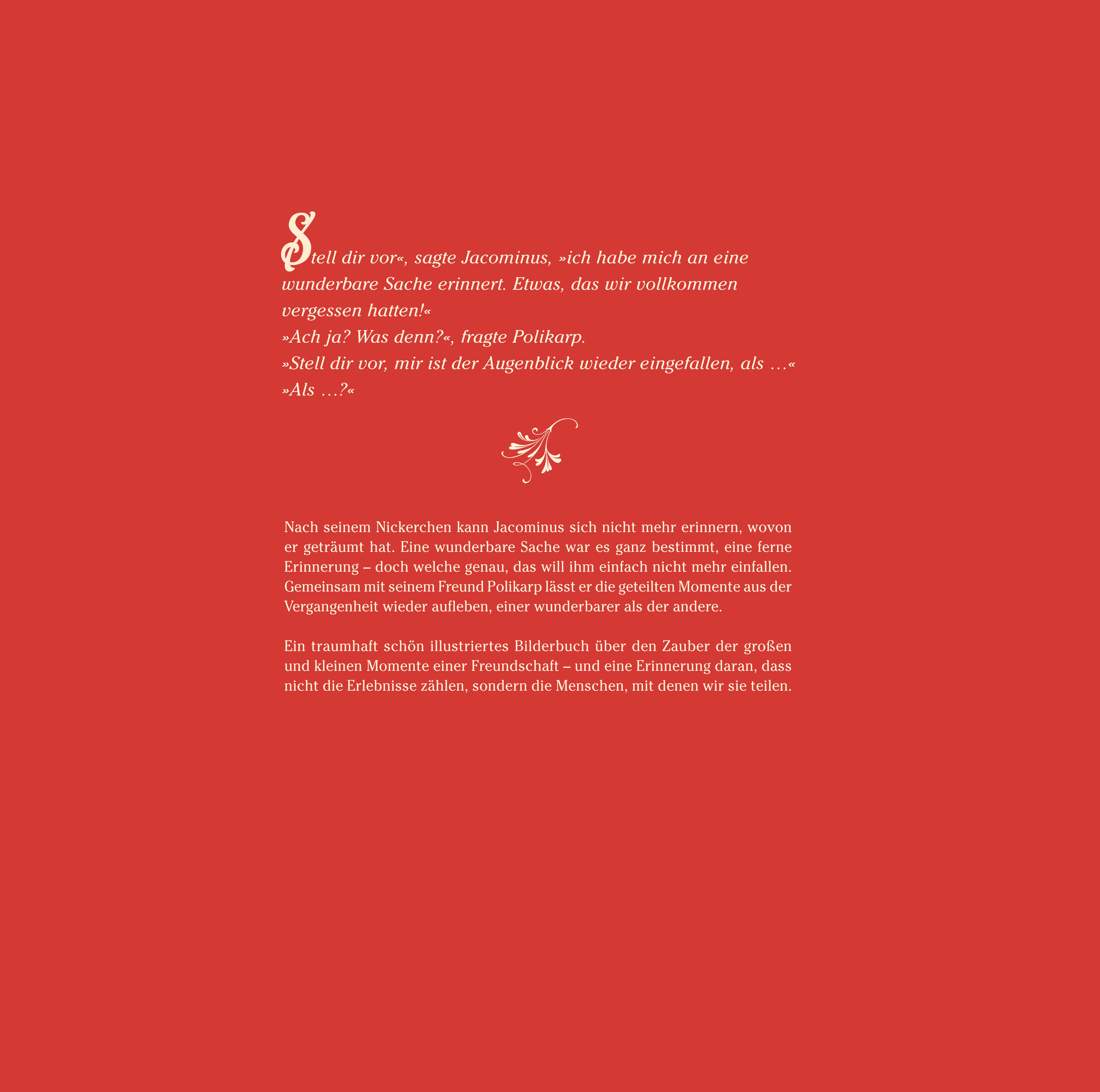 Als Jacominus aus einem Nickerchen erwacht, kann er sich nicht mehr erinnern, wovon er geträumt hat. Eine wunderbare Sache war es ganz bestimmt, eine ferne Erinnerung - doch welche genau, das will ihm einfach nicht mehr einfallen. Gemeinsam mit seinem Freund Polikarp sitzt er im Garten und die beiden überlegen angestrengt. Ist ihm vielleicht die Melodie des Lieds wieder eingefallen, das die beiden so gerne zusammen gesungen haben? Der Witz, den Jacominus immer erzählt hat, um alle aufzuheitern? Oder das Rezept für den leckeren Apfelkuchen seiner Großmutter? Doch all das war es nicht, da ist Jacominus ganz sicher. Da fällt es ihm wieder ein: Sein Traum hat ihn weit in die Vergangenheit getragen, zu dem Tag, an dem er Polikarp kennenlernte, als die beiden noch ganz klein waren ...