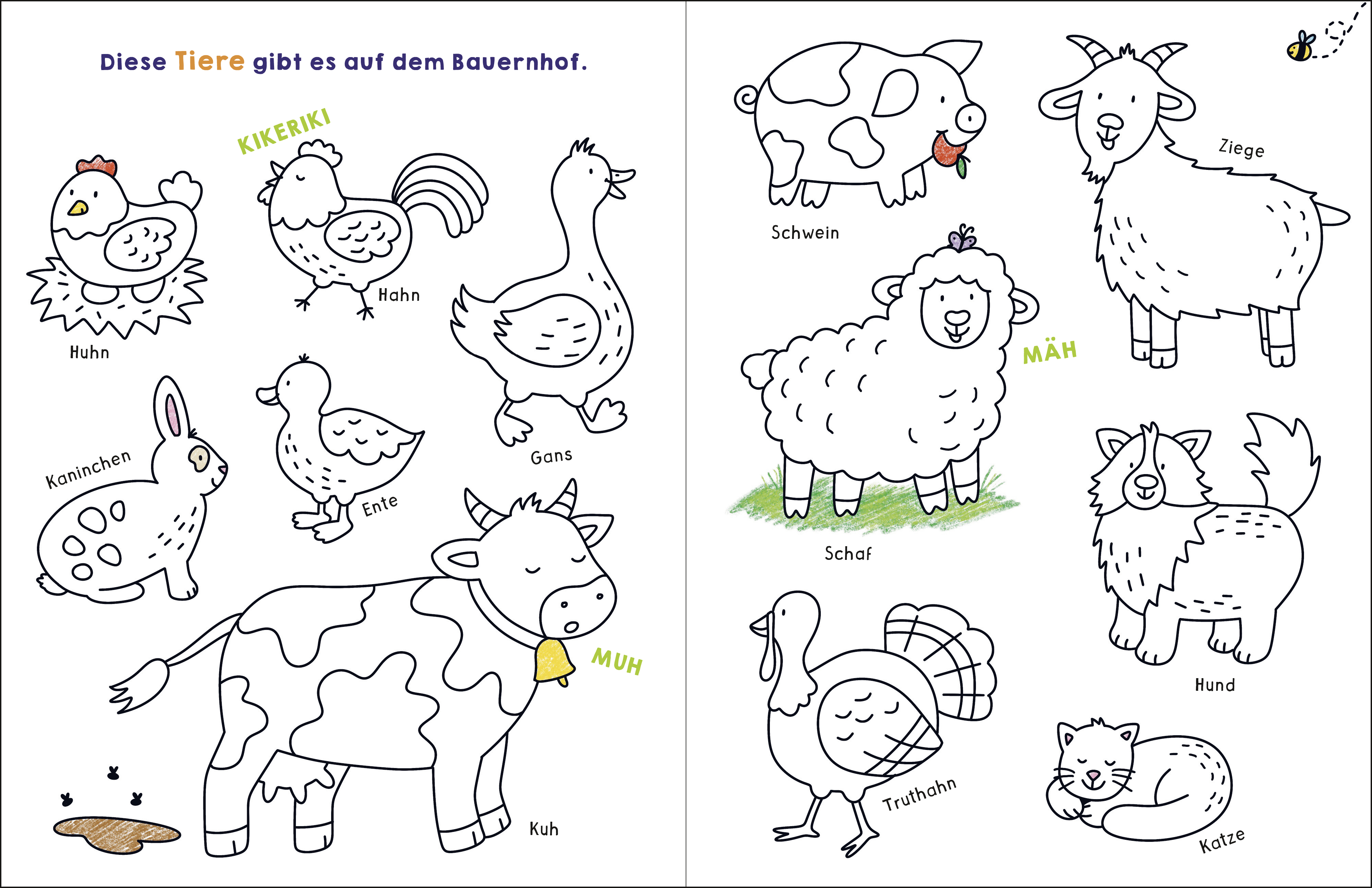 Hier müssen Tiere versorgt, Feldfrüchte geerntet und die Kunden des Hofladens bedient werden, es gibt also viel zu tun! Doch zum Glück macht es großen Spaß, die liebevoll illustrierten Szenen und Motive auszumalen und eine kleine Geschichte führt durch die Abenteuer, die Kinder ab 4 Jahren auf dem Bauernhof erleben können. Und wenn es doch einmal anstrengend wird, dann sorgen die auf jeder Doppelseite versteckten Such-Elemente wie das lustige Huhn für ganz viel Abwechslung! Ganz spielerisch lernen die Kinder dabei, welche Lebensmittel auf dem Bauernhof produziert werden und welche Tiere und Maschinen es dort gibt.