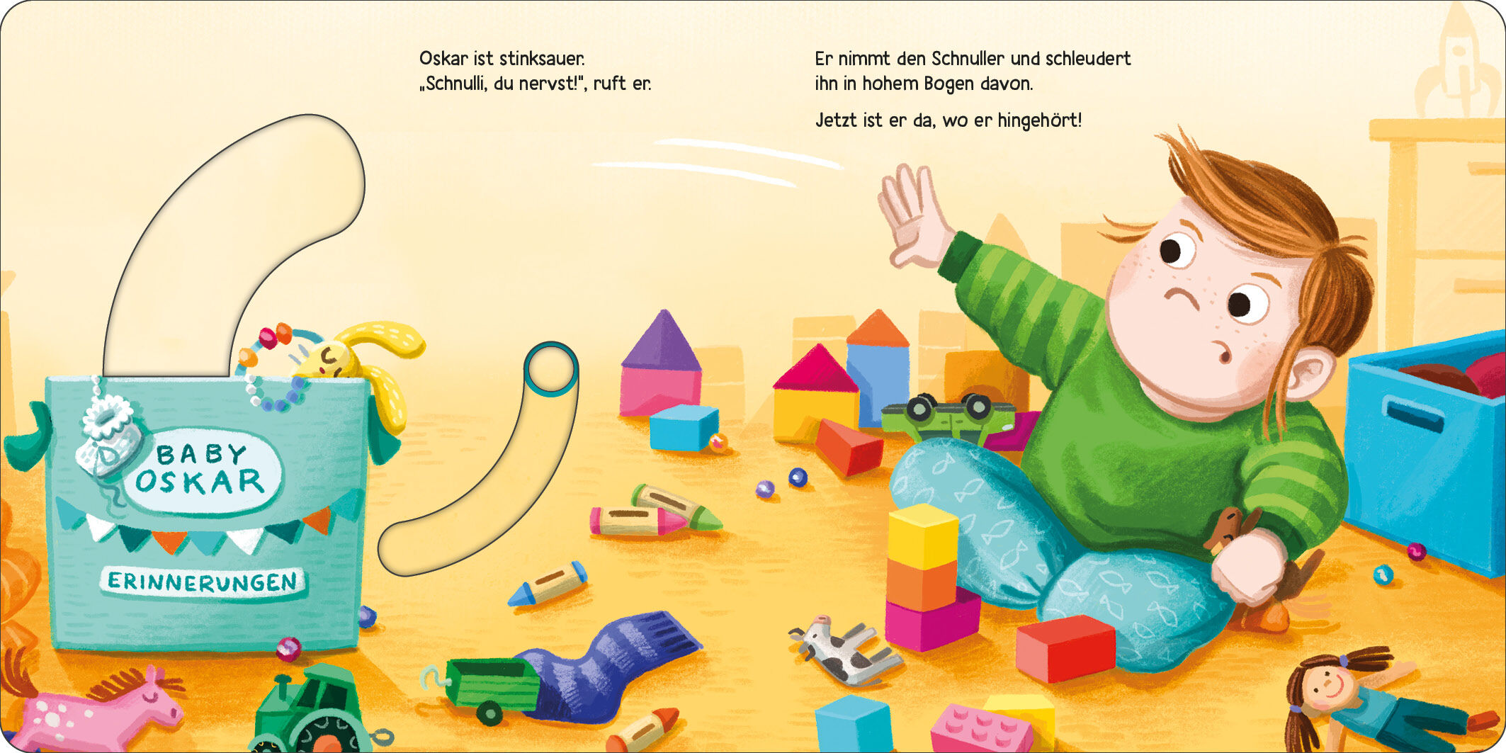 Oskar hat es tatsächlich geschafft! Er braucht keinen Schnuller mehr. Doch sein Schnulli will das einfach nicht begreifen. Egal, was Oskar tut, Schnulli taucht immer wieder auf - ob beim Möhrenernten, Angeln, im Sandkasten oder beim Baden. Schnulli kann sich nicht von Oskar trennen. Da hilft nur eines: Wusch, und ab die Post zu den anderen »Babysachen«!