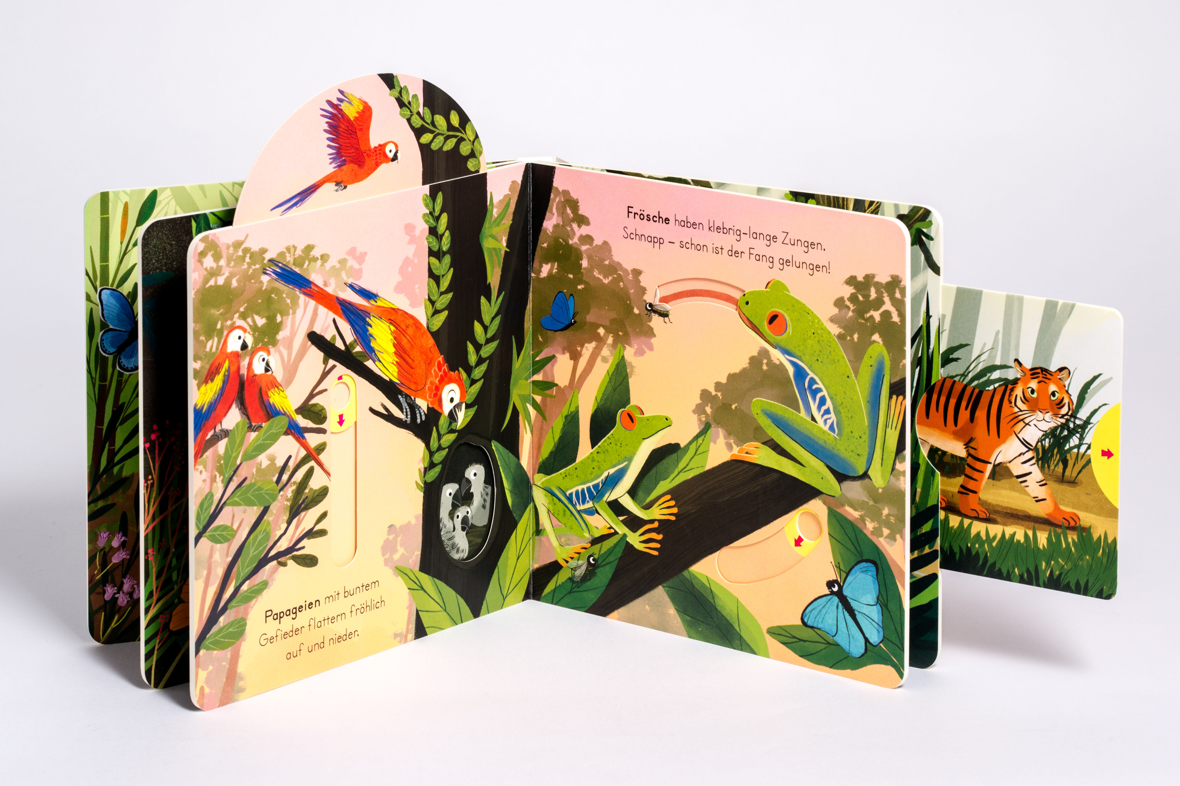 Pandas, Krokodile, Papageien oder Faultiere - im Dschungel gibt es viele Tiere zu entdecken! Mit nur einer Handbewegung kann das Kind die Tiere klettern, fressen oder fliegen lassen. So wird auf ganz spielerische Weise erstes Sachwissen über den Lebensraum »Dschungel« vermittelt. Die vielfältigen Spieleffekte sorgen dafür, dass es nie langweilig wird!Ein spannendes Sach-Pappbilderbuch mit vielen Schiebern und Ausziehseiten für neugierige Kinder ab 2 Jahren- Spielspaß und Lerneffekt in einem Buch