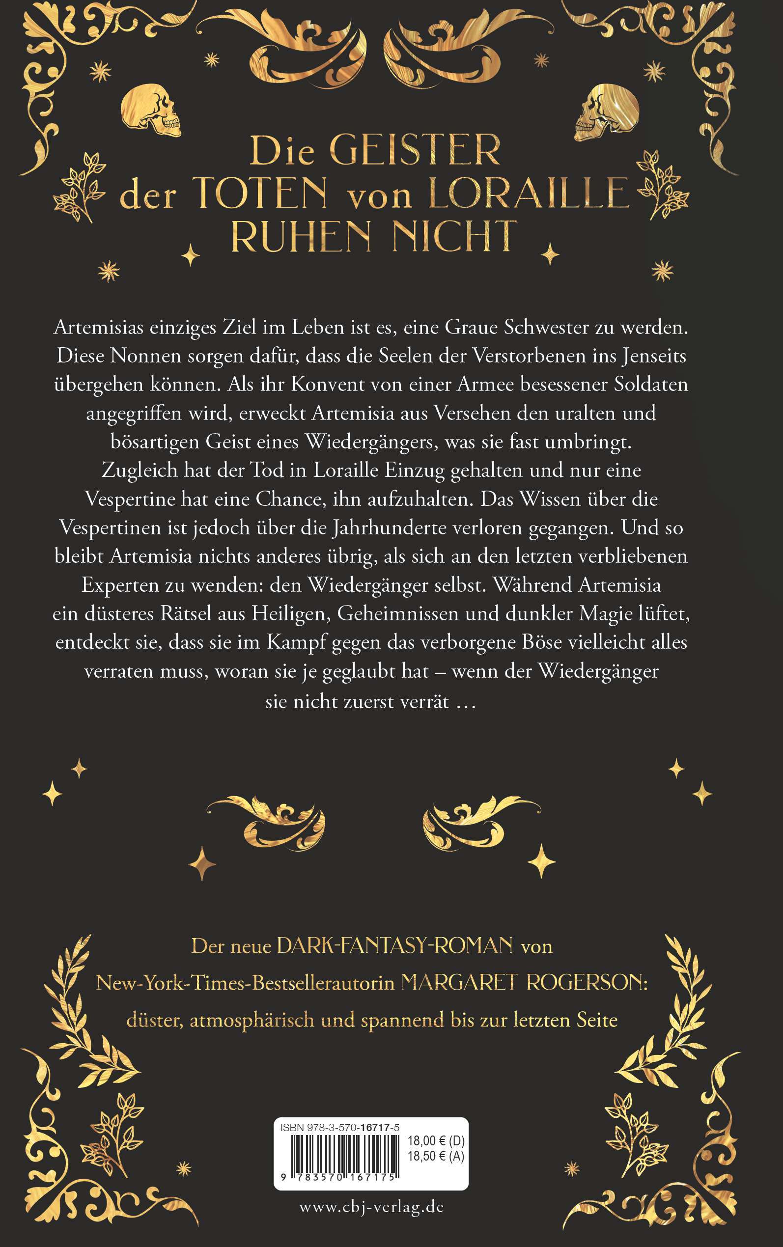 Artemisias einziges Ziel im Leben ist es, eine Graue Schwester zu werden. Diese Nonnen sorgen dafür, dass die Seelen der Verstorbenen ins Jenseits übergehen können. Als ihr Konvent von einer Armee besessener Soldaten angegriffen wird, erweckt Artemisia aus Versehen den uralten und bösartigen Geist eines Wiedergängers, was sie fast umbringt. Zugleich hat der Tod in Loraille Einzug gehalten und nur eine Vespertine hat eine Chance, ihn aufzuhalten. Das Wissen über die Vespertinen ist jedoch über die Jahrhunderte verloren gegangen. Und so bleibt Artemisia nichts anderes übrig, als sich an den letzten verbliebenen Experten zu wenden: den Wiedergänger selbst. Während Artemisia ein düsteres Rätsel aus Heiligen, Geheimnissen und dunkler Magie lüftet, entdeckt sie, dass sie im Kampf gegen das verborgene Böse vielleicht alles verraten muss, woran sie je geglaubt hat - wenn der Wiedergänger sie nicht zuerst verrät ...Der neue Dark-Fantasy-Roman von New-York-Times-Bestsellerautorin Margaret Rogerson über ein Mädchen mit mythischen Fähigkeiten, das ihre Welt vor den ruhelosen Geistern der Toten bewahren muss.