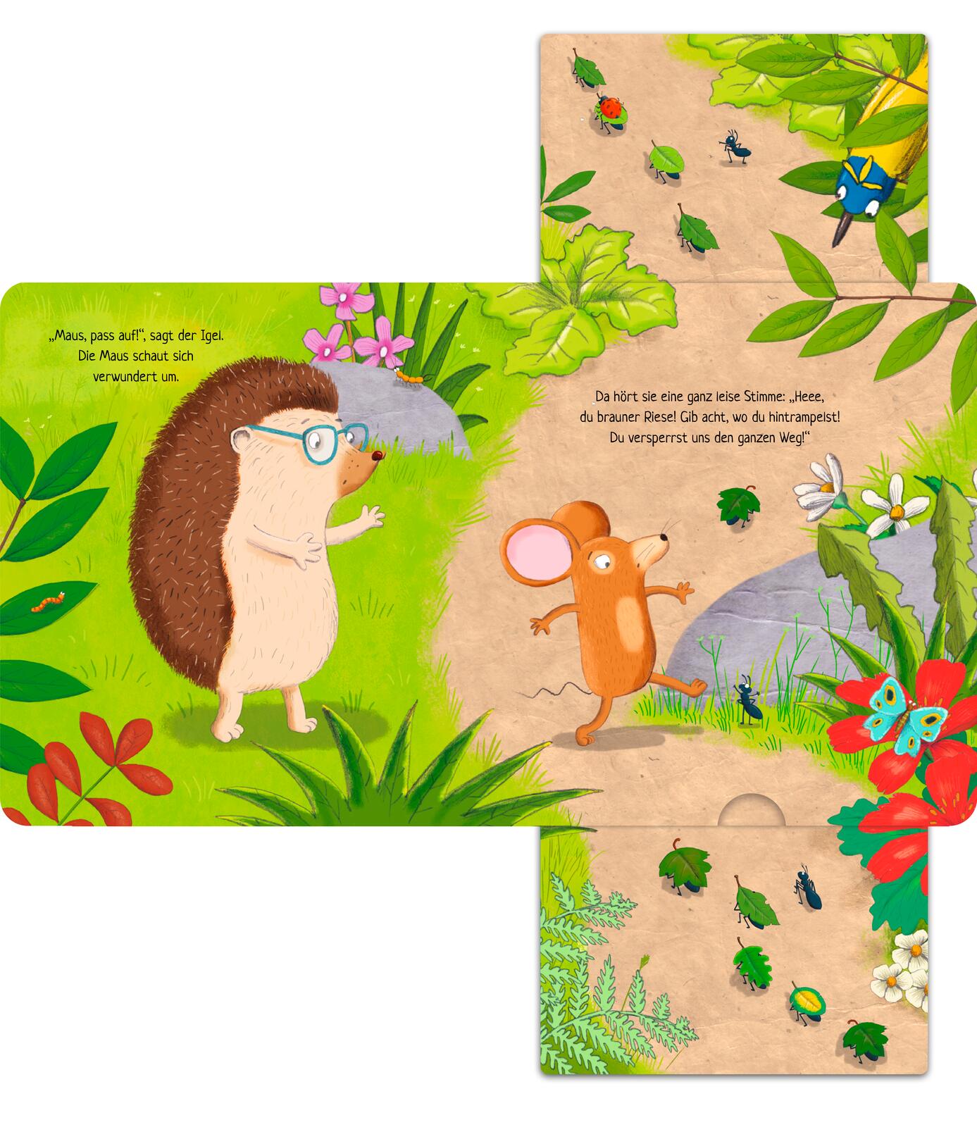 Immer sagen alle KLEINE Maus zur Maus. Sogar ihr Freund Igel nennt sie so. Und zu allem Überdruss tritt der Bär auch noch fast auf sie drauf. Die Maus hat es ganz schön satt. Sie ist NICHT klein, bitteschön. Doch da tönen leise Stimmen an ihr Ohr. "He, du brauner Riese! Pass auf, wo du hintrampelst!" Es sind Ameisen, die ihr Abendessen nach Hause tragen. Ob die Maus ihnen wohl helfen wird, ihr Essen nach Hause zu tragen? Eins jedenfalls ist klar: Manchmal sind die Kleinen die Allergrößten!