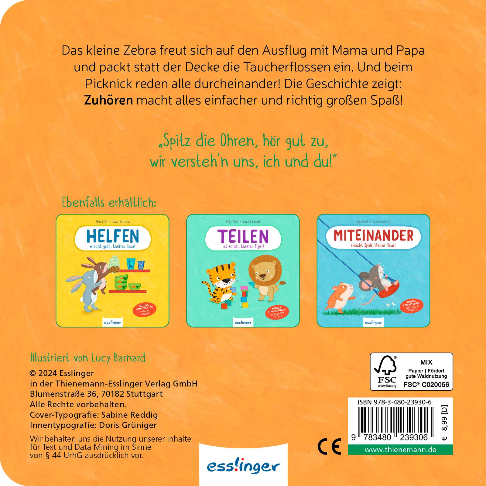 In dieser Alltagsgeschichte wird auf humorvolle Weise und mit einem kurzen eingängigen Reim auf jeder Seite erzählt, wie das aufmerksame Zuhören Kindern im Umgang miteinander hilft.