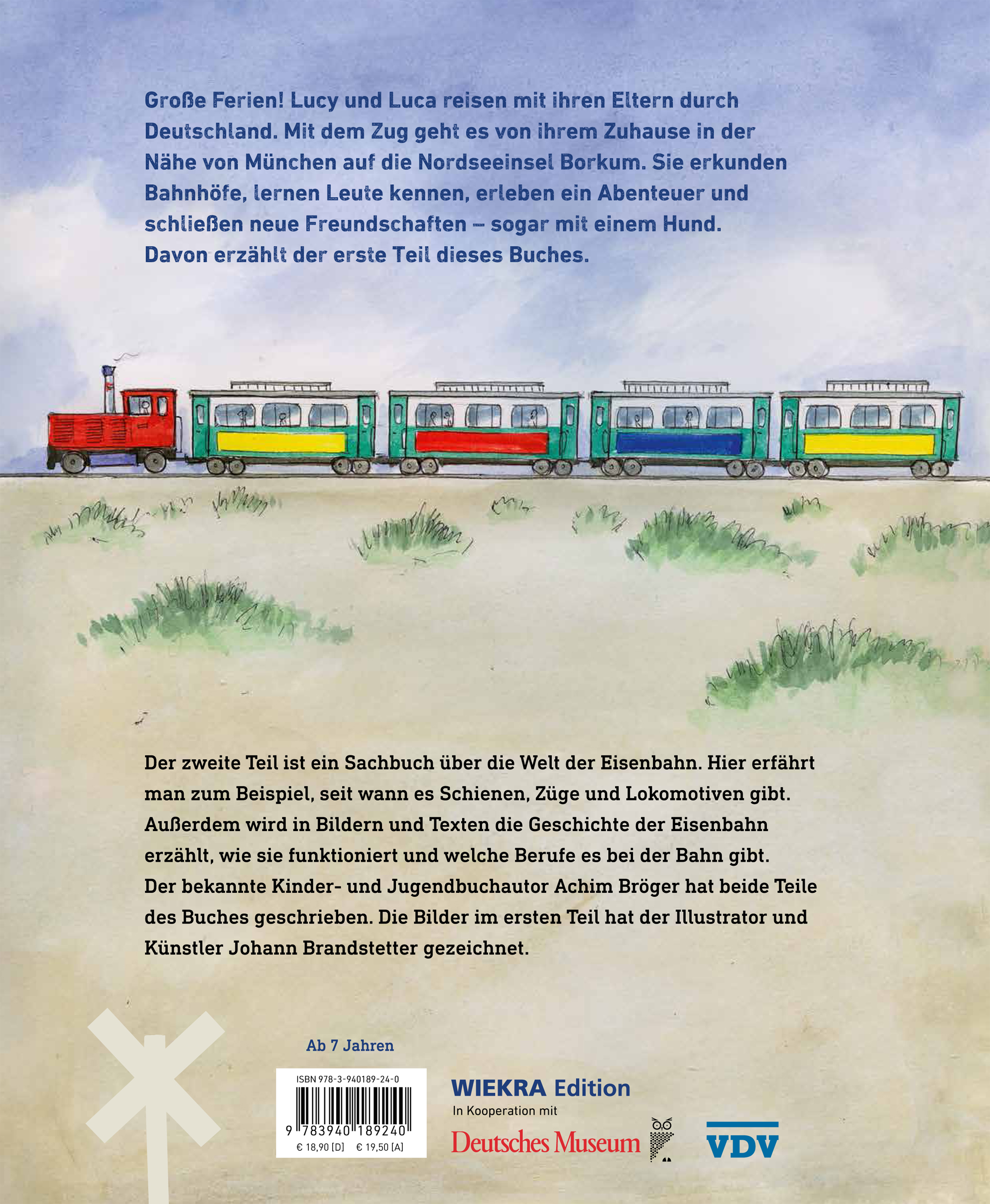 | Schlagworte | Abenteuer • Bahnhof • Bahnreise • Bayern • Borkum • Deutsches Museum • Deutschland • Eisenbahn • Erlebnis • Familiengeschichte • Freundschaft • Hannover • Kinderbuch • Kindergeschichte • klimafreundlich • Lernen • Lokomotive • München • Niedersachsen • Nordseeinsel • Sachbuch • Schienenverkehr • Uelzen • Umwelt • VDV • Verkehrsträger • Zugreise |