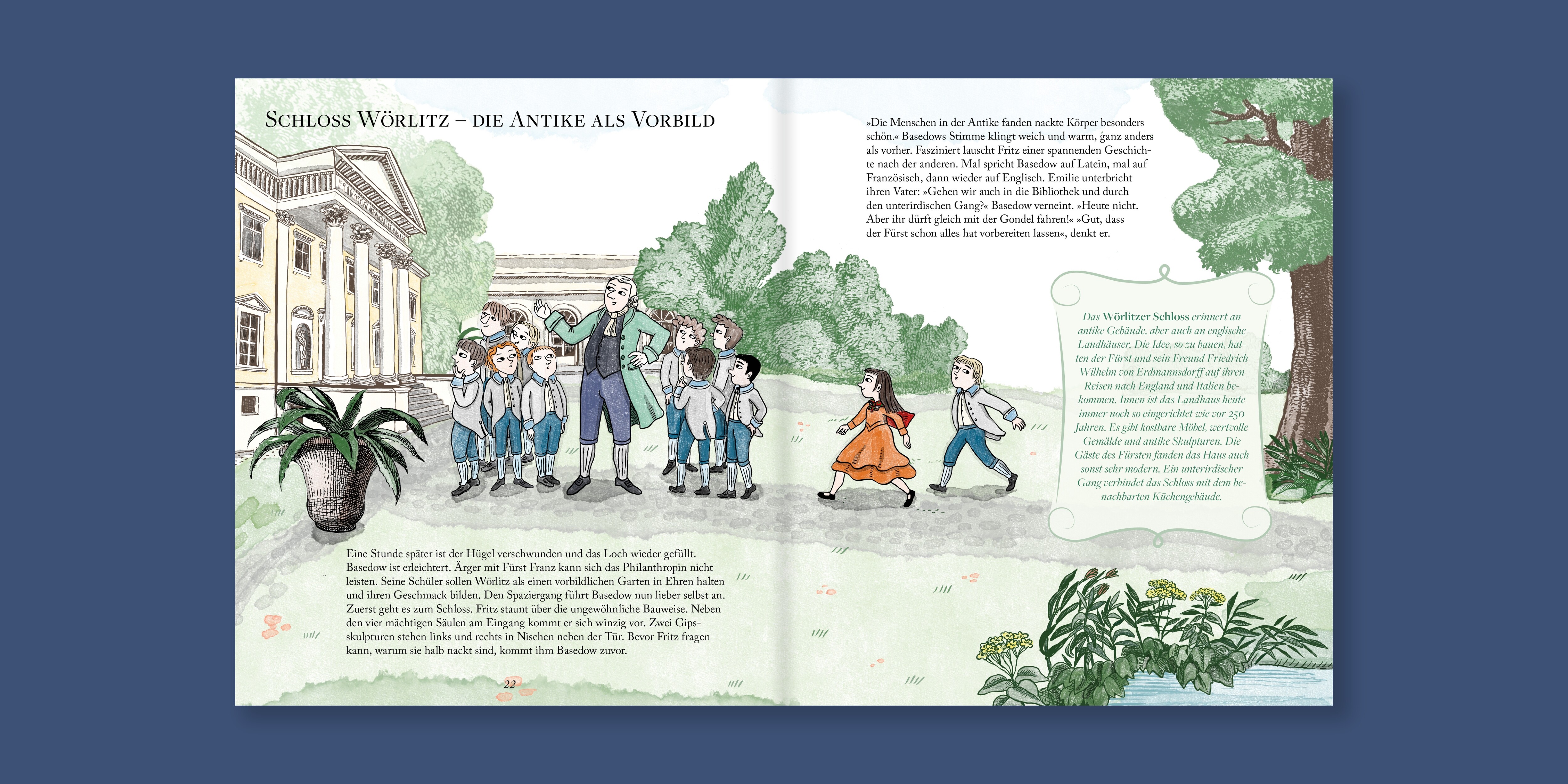 Entlang einer witzigen Story zwischen Fritz und Emilie, angereichert mit vielen spannenden Sachinformationen, erklärt das Buch wichtige Themen dieser Epoche für Kinder ab 8 Jahren. Es geht um die Ideale der Aufklärung, die Schulreform, den Bildungsenthusiasmus der 1770er Jahre, Lernen durch Anschauung, die fürstliche Politik und Toleranz - auch in religiöser Hinsicht. Es geht um Vulkane in Dessau, Gespräche in Latein und Französisch, Tischlern, Sternwarten, Theaterspielen, Sportunterricht, Sexualkunde, Gemüseziehen, Lachse fangen, Schuluniform, Beatles-Haarschnitte, Raufereien zwischen Lehrern, lange Schultage und vieles mehr. Mit lebendigen Illustrationen, die an die Ästhetik des 18. Jahrhunderts anknüpfen, nimmt das Buch junge Leserinnen und Leser direkt mit in diese Zeit.