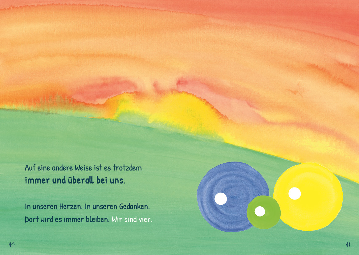 Mich faszinieren vor allem die Bilder. Durch reduzierte Bilder und einfachen Formen wird viel erzählt: Der Zusammenhalt als Familie, die Freude auf das Geschwisterchen und die Fehlgeburt. Manu Schimmelmann findet aber auch greifbare Bilder für die unterschiedlichen Gefühle der Trauer und für die Erinnerung. Diese Bilder bieten viel Raum für das Gespräch darüber. Und am Ende des Buches steht die Einladung, selber kreativ zu werden.
