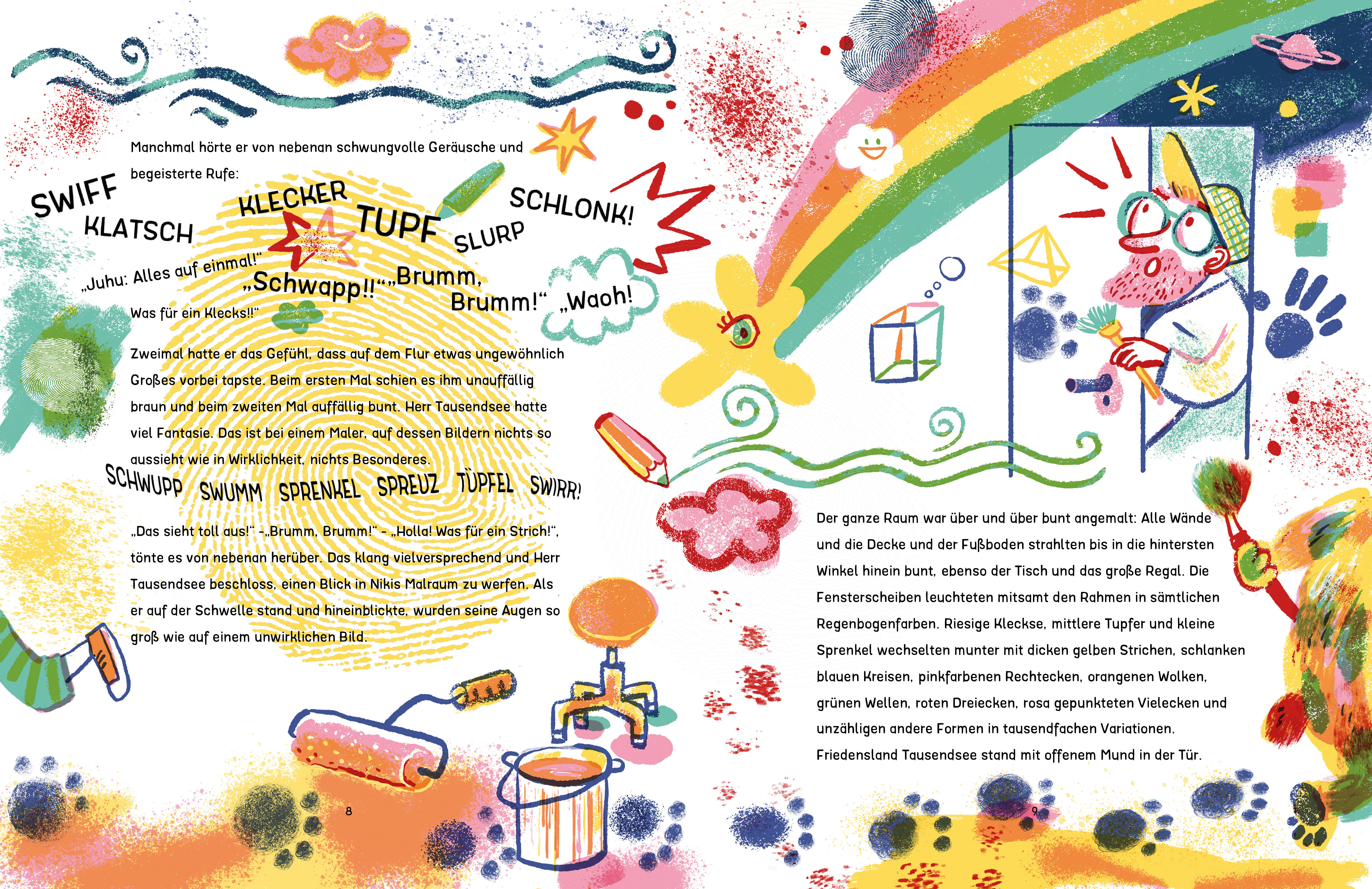 Wenn Niki malt, dann denkt sie sich auch gerne ausgefallene Geschichten aus. Im Kunsthaus Kunterbunt bei Friedenstag Tausendsee sind der Fantasie keine Grenzen gesetzt. SWIFF - KLATSCH - KLECKER - TUPF! Wow, was für ein Klecks! Aber na so was? Das Zimmer ist ja über und über mit bunten Farben bemalt. Wer war das?