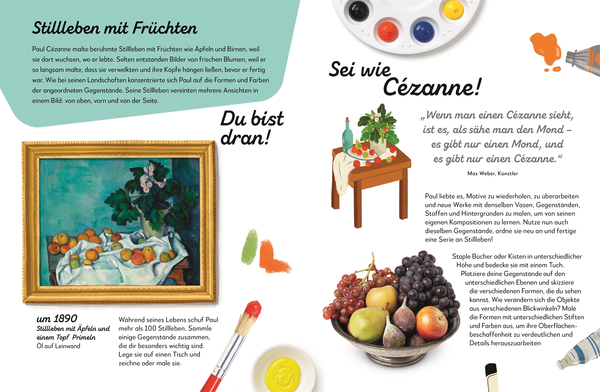 - Selbst kreativ werden: Enthält Anregungen, den Stil von Paul Cézanne auszuprobieren, und Tipps zur Gestaltung eines Stilllebens.
