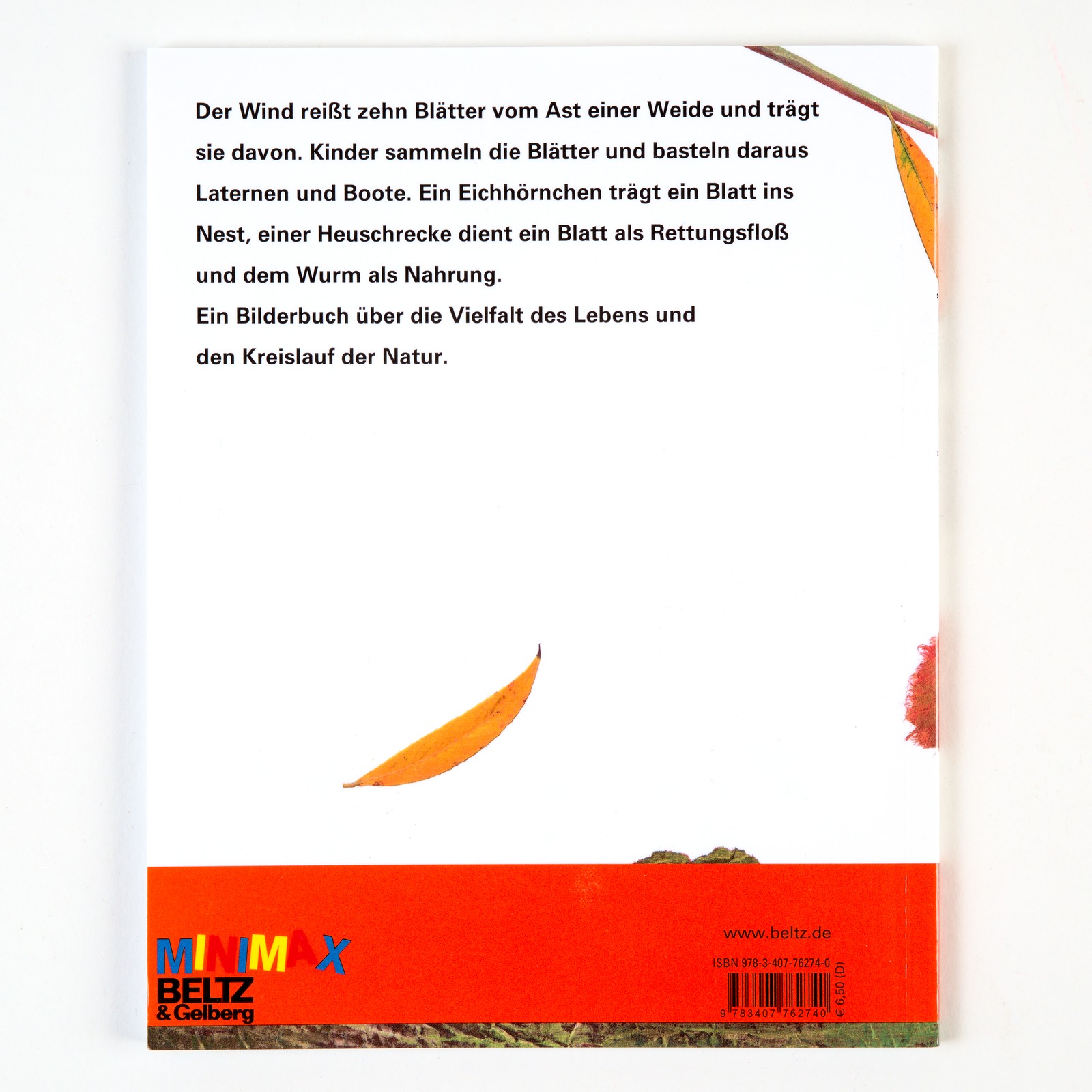 Zehn Weideblätter lösen sich im Herbststurm von den Ästen. Ein Blatt landet im Wasser, andere Blätter auf der Erde. Das freut Mensch und Tier: Kinder sammeln die Blätter und basteln daraus Laternen und Boote. Ein Eichhörnchen trägt ein Blatt ins Nest, einer Heuschrecke dient ein Blatt als Rettungsfloß. Am Ende zieht ein Regenwurm das letzte Blatt unter die Erde und im Frühling sprießen mit seiner Hilfe neue Bäume. Die eindrücklichen Collagen und der poetische Text laden dazu ein, den Rhythmus der Natur zu erleben.