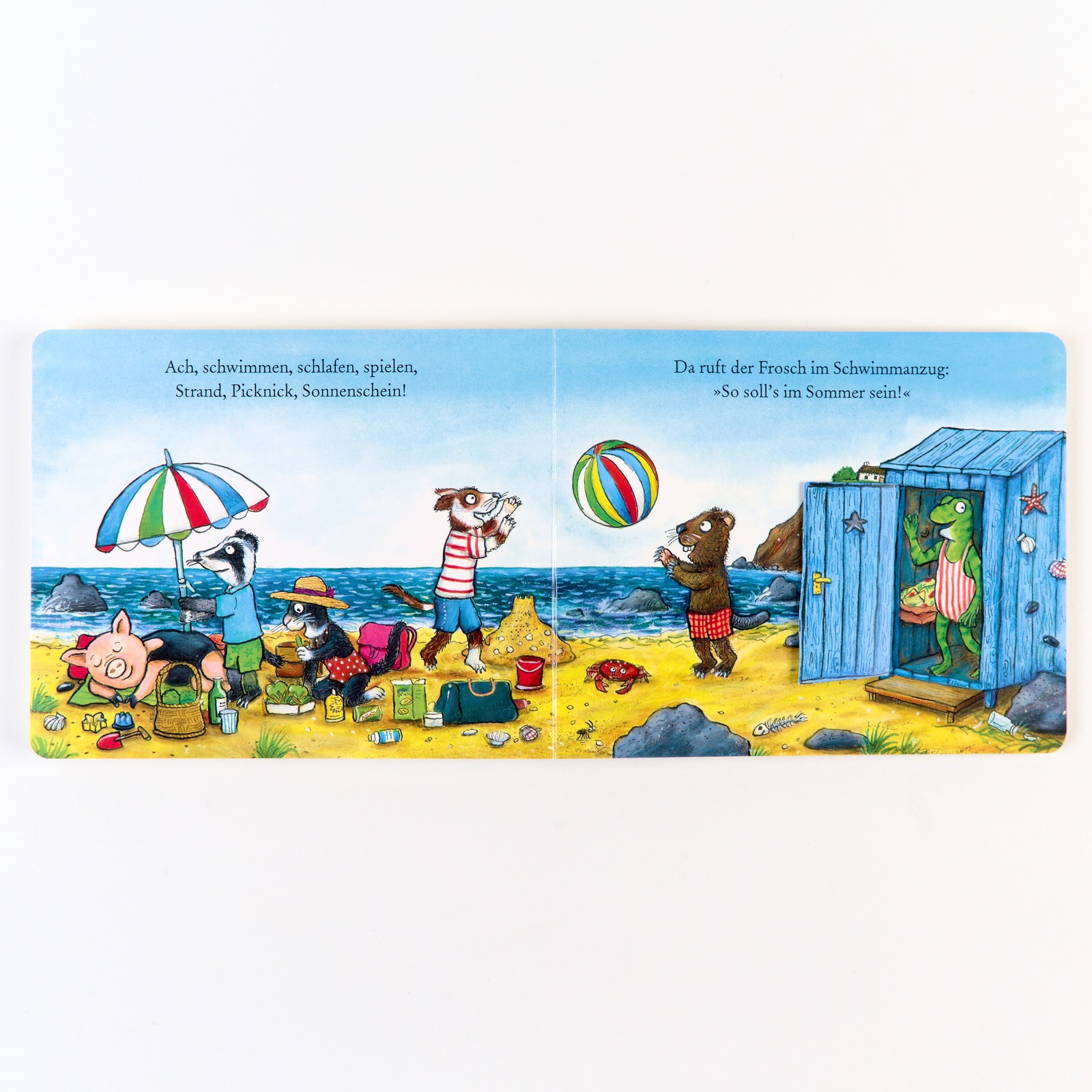 »Das Erfolgsduo Julia Donaldson und Axel Scheffler begleitet die bunte Tiertruppe mit gewohnt fröhlichen Reimen und witzigen, detailreichen Bildern an den Strand. Die Klappen des Pappbilderbuchs sind dabei gekonnt in die Geschichte integriert.« Extrablatt ›Sommer, Sonne, Schwimmvergnügen‹, Deutsche Akademie für Kinder- und Jugendliteratur, 2/2025