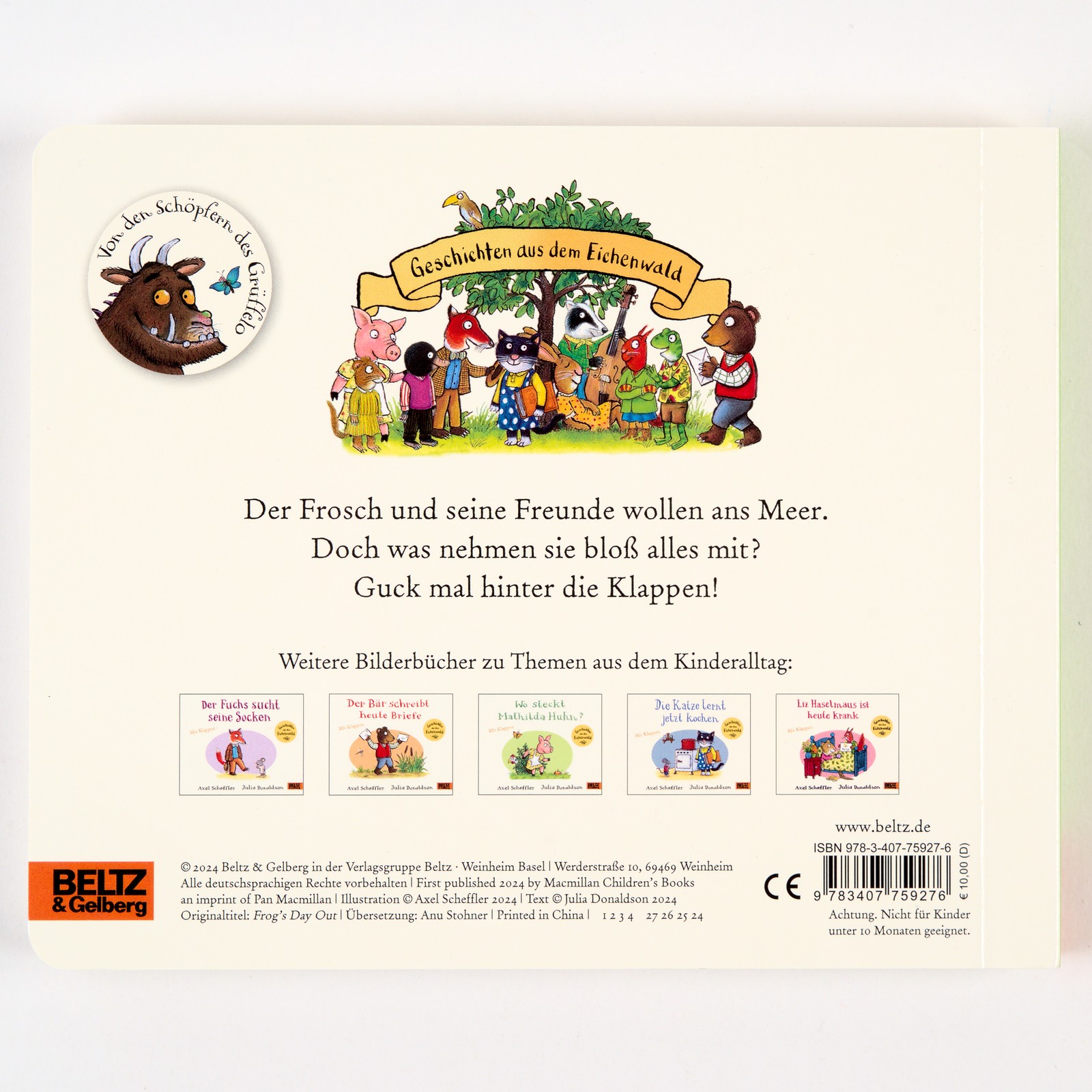 Ein Pappbilderbuch von den Schöpfern des Grüffelo mit vielen Klappen für neugierige Kinder, die begeistert beim Suchen helfen können. Mit bunten Bildern und lustigen Reimen, mit denen Vorlesen großen Spaß macht.