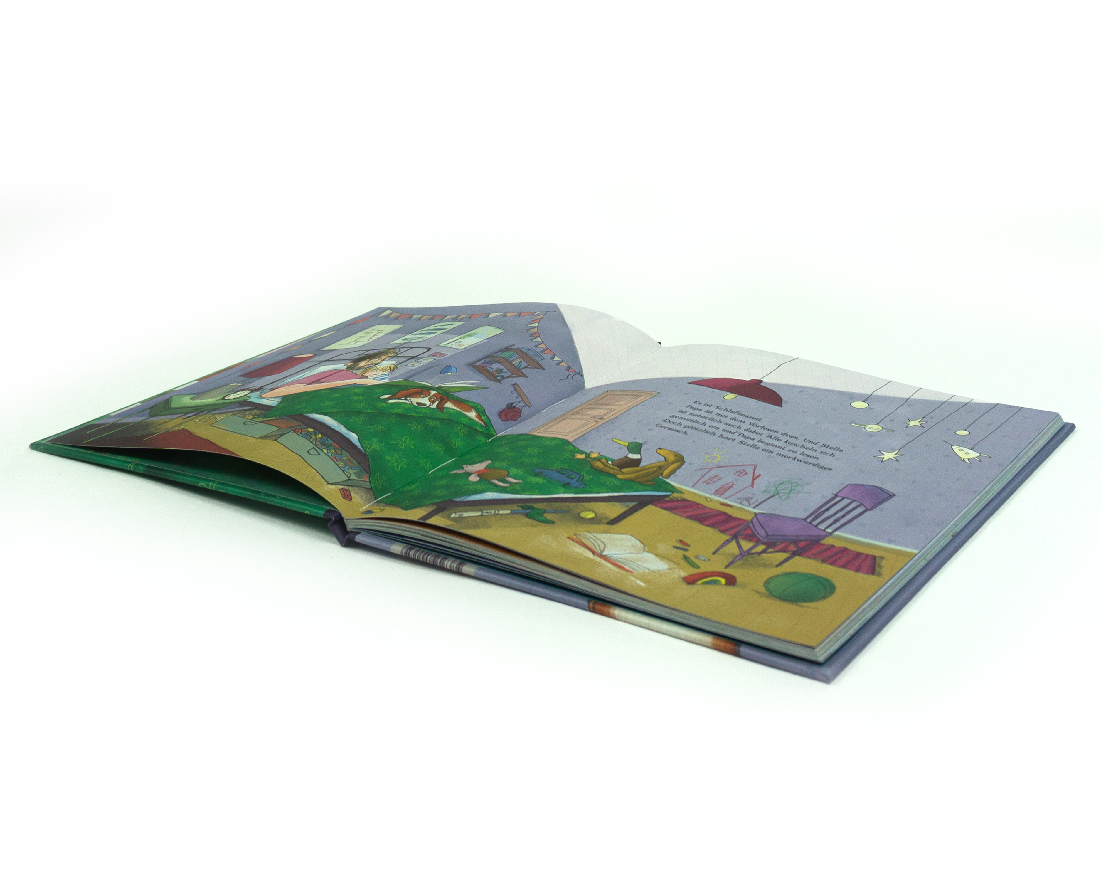 Papa liest vor, aber Stella kann einfach nicht einschlafen. Was hat sie da gehört: Eichhörnchen, die einen Tunnel in die Küche gegraben haben? Oma, die einen dicken Braten bringt? Oder doch einen Bus voller Hunde, der ins Wohnzimmer gekracht ist? Die Gedanken gehen mit Stella durch. Erst als Mama nach Hause kommt, kehrt endlich Ruhe ein.
