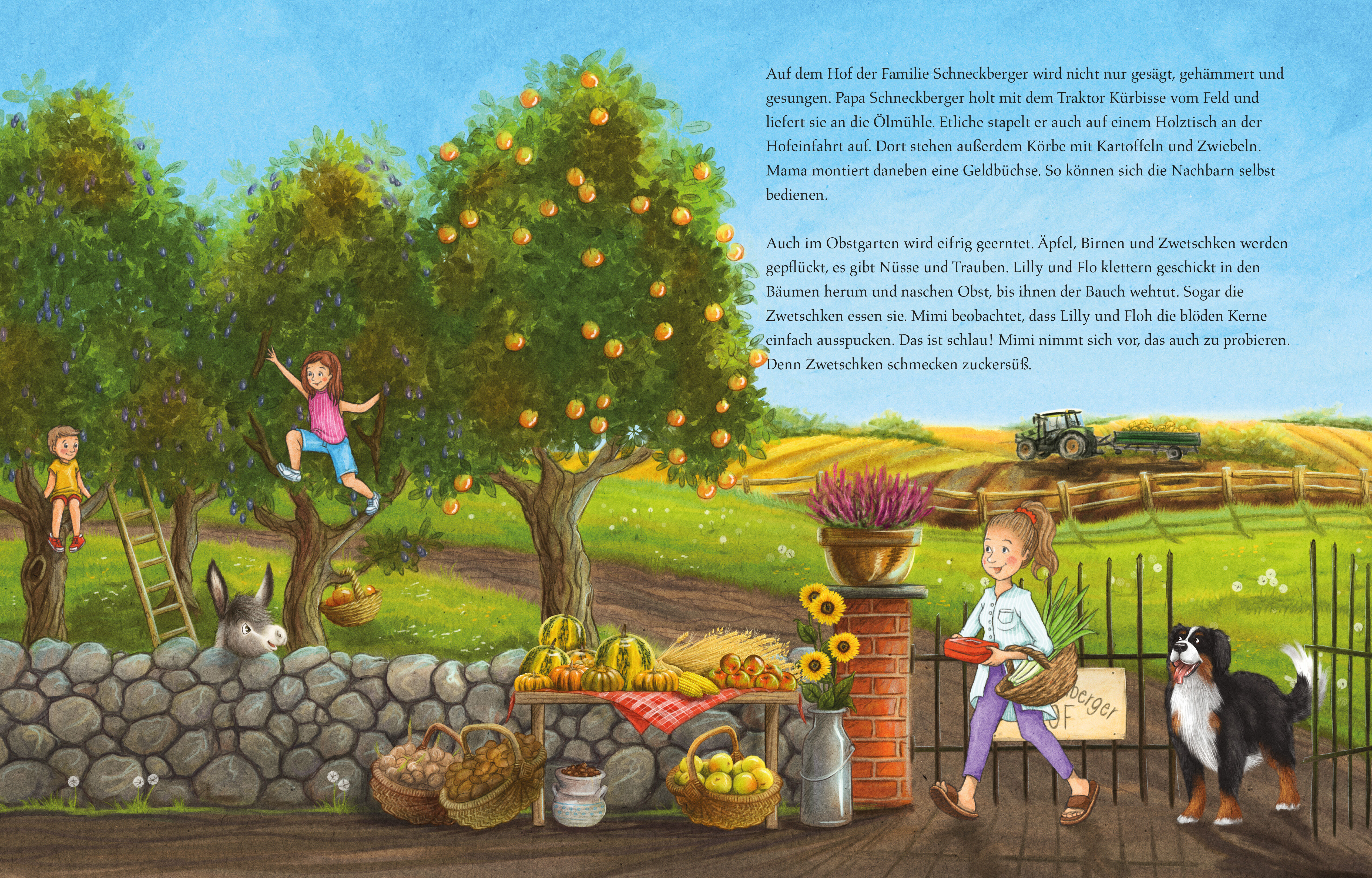 Eselchen Mimi erlebt die Freude der Erntezeit in einem Buch über die Schönheit des Herbstes und das gemeinsame Feiern.