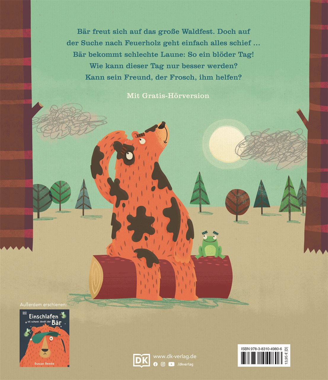 Bei Bär geht heute einfach alles schief: Erst zieht er sich beim Brennholzsammeln einen schmerzhaften Splitter in die Tatze. Dann fällt ihm ein Baumstamm auf den Kopf. Und als es auch noch zu regnen beginnt, stolpert er in eine riesige Pfütze. Verzweifelt klagt er dem Frosch sein Leid. Der zeigt ihm, dass viele Dinge manchmal schlimmer aussehen, als sie wirklich sind. Und so wird es doch noch ein richtig schöner Tag für Bär und seine Freunde.