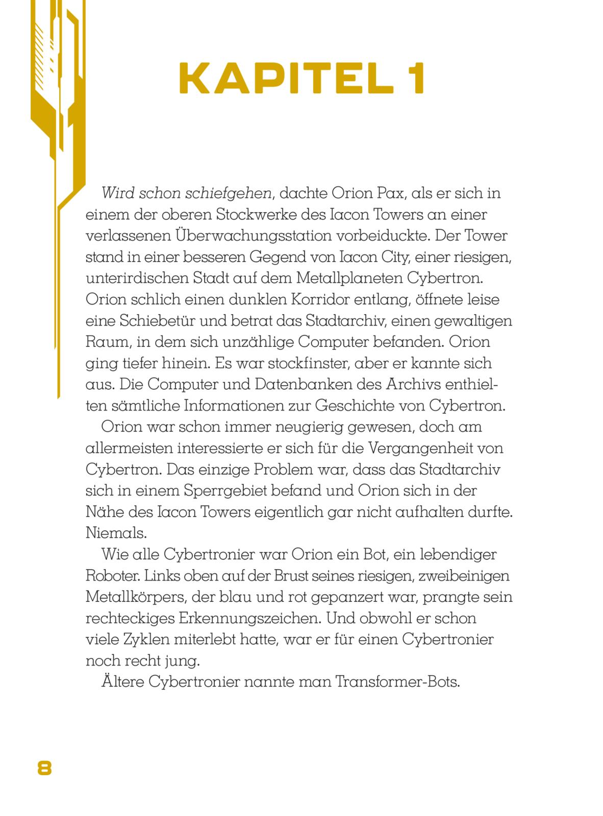 Orion Pax ist ein Bot, wie es viele in Iacon City auf dem Planeten Cybertron gibt. Im Gegensatz zu den älteren Bots hat er keinen Transformationsschalter und kann sich nicht in ein Fahr- oder Flugzeug verwandeln. Dafür schuftet er jeden Tag in den Minen, um das kostbare Energon zu schürfen, den Treibstoff für alle Cybertronier. Doch ist das seine wahre Bestimmung? Mit seinem Freund D-16 versucht Orion herauszufinden, wer er wirklich sein kann, und gerät dabei zwischen die Fronten. Ab jetzt geht es nicht mehr nur um ihn, sondern um nichts weniger als die Freiheit aller Bots und Transformers auf Cybertron.