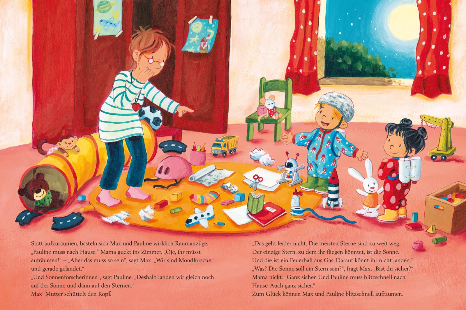 Max und Pauline wollen nicht aufräumen. Sie möchten viel lieber zum Mond fliegen. Dafür brauchen sie aber Raumanzüge, sagt Felix, der große Bruder von Max. Denn im Weltraum gibt es keine Luft zum Atmen. Bei einem Ausflug ins Planetarium erfahren die Kinder außerdem jede Menge über die Sonne, den Mond, die Erde und andere Planeten. Schließlich fehlt nur noch eine Rakete - dann kann die Reise zu den Sternen beginnen!
