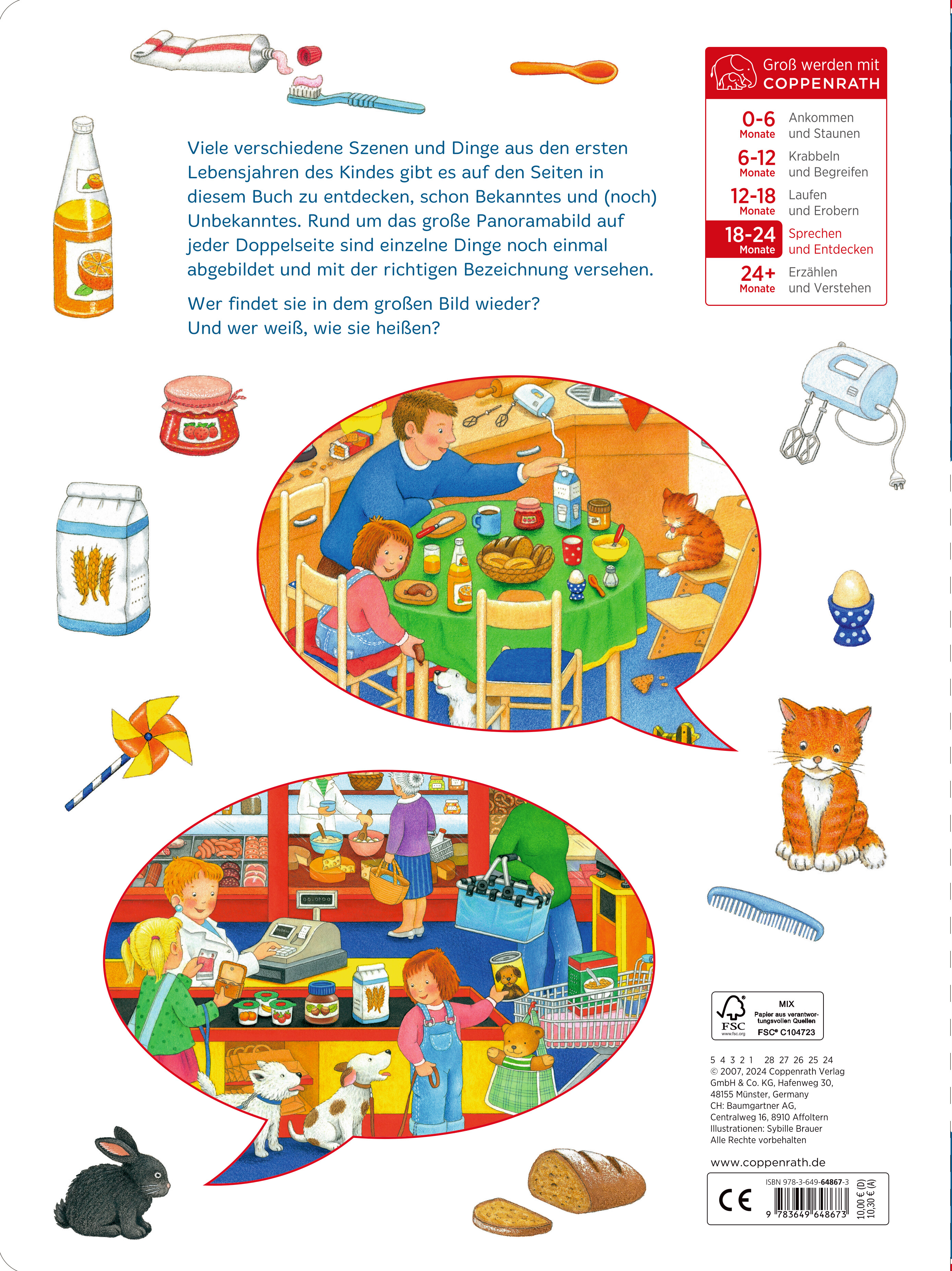 Viele verschiedene Dinge und Szenen aus den ersten Lebensjahren des Kindes gibt es in diesem Buch zu entdecken, schon Bekanntes und (noch) Unbekanntes. Rund um das große Panoramabild auf jeder Doppelseite sind einzelne Dinge noch einmal abgebildet und mit der richtigen Bezeichnung versehen. Wer findet sie auf dem großen Bild wieder? Und wer weiß, wie sie heißen?