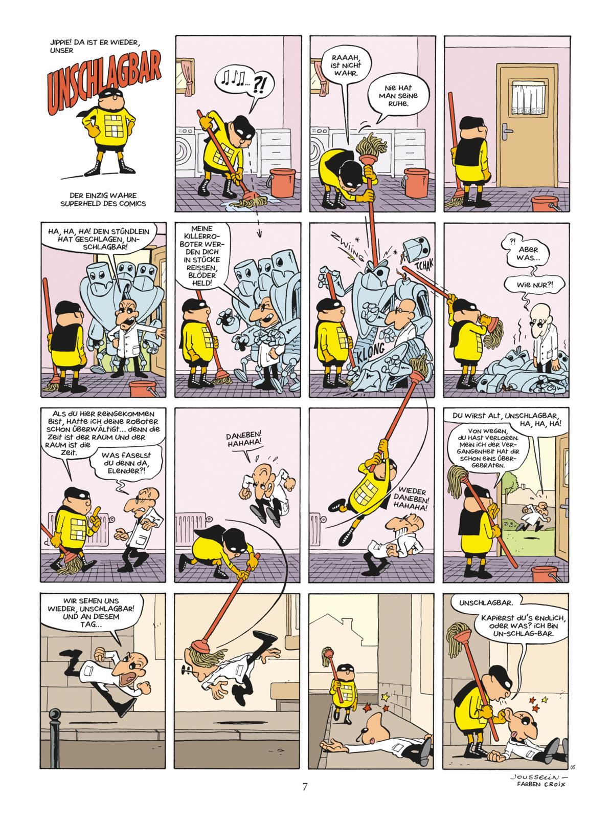 Ob rücksichtslose Kunstdiebe, Killerroboter oder ein fieser Megavirus - der Held mit dem unbescheidenen Namen 'Unschlagbar' rettet die Welt unermüdlich vor dem Bösen. Dabei nutzt er alle Register des Comic-Mediums: Immer wieder springt er von Panel zu Panel, greift in der Geschichte vor und trickst so seine verblüfften Gegner ein aufs andere Mal aus. Auf diese Weise entstehen absurd komische Szenen, die für ein dynamisches Leseerlebnis sorgen. Erstmals erscheinen die Comics als Hardcoveralben gesammelt in einem Schuber.