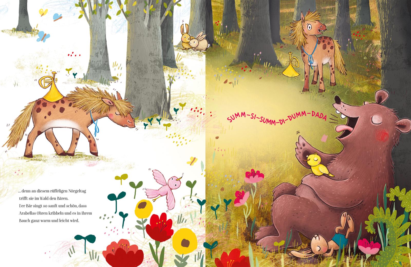 Arabella hat einen Traum, sie will Trompete spielen können. Die anderen Ponys lachen sie aus, denn Ponys spielen einfach nicht Trompete. Von wegen! Arabella kauft sich das Instrument und beginnt zu tröten. Leider klingt das ganz fürchterlich. Mit der Hilfe und Motivation ihrer Freunde übt Arabella fleißig jeden Tag. Und bei der nächsten großen Tierparade läuft sie mit ihrem Instrument ganz vorne mit!