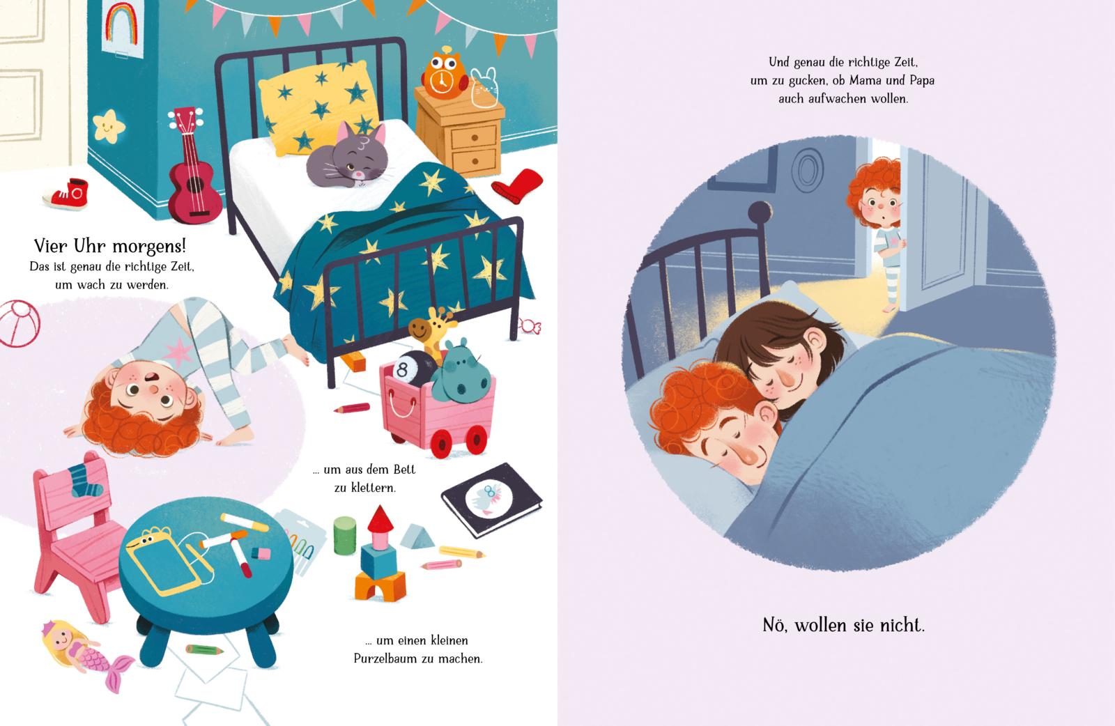 Wenn du um vier Uhr morgens wach wirst, dann merkst du sicher gleich, dass das genau die richtige Zeit zum ... Aufstehen ist! Nur Mama und Papa sind da anderer Meinung. Die schlafen einfach weiter. Aber das macht ja nichts. Vier Uhr morgens ist sowieso die perfekte Zeit, um Kater Karl dein Lieblingsbuch vorzulesen, Papas Regenschirm auszuprobieren, über den Rand zu malen, einen großen Schokokeks zu essen und beim Blumengießen pitschenasse Füße zu bekommen.