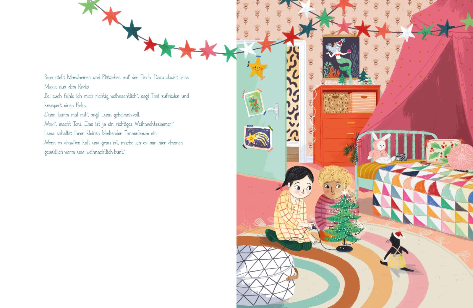 Aber als Papa einen Stapel Schuhkartons zum Altpapier bringen möchte, hat Luna eine Idee: Sie basteln Weihnachtszauber zum Mitnehmen! Denn darum geht es doch an Weihnachten, oder? An andere Menschen zu denken, ihnen eine Freude zu machen und Festlichkeit zu verschenken. Luna und Toni verteilen ihren Weihnachtszauber in der Nachbarschaft und sie sind ganz verblüfft, wie gut er wirkt! Sogar Herr Meier ist plötzlich dankbar und überhaupt nicht mehr unfreundlich.