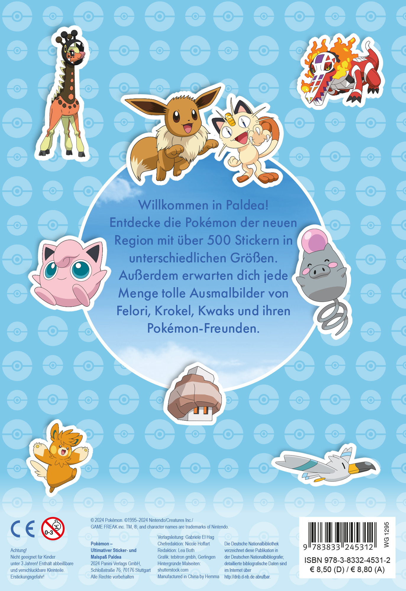 Willkommen in Paldea! Entdecke die Pokémon der neuen Region mit über 500 Stickern in unterschiedlichen Größe. Außerdem gibt es jede Menge Ausmalbilder von Felori, Krokel, Kwaks und ihren Pokémon-Freunden.