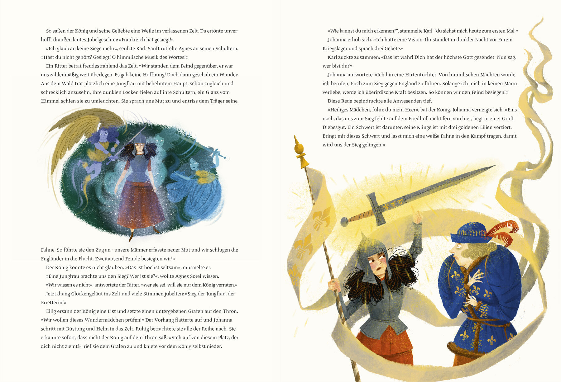 Das berühmte Schiller-Drama kindgerecht erzählt und detailreich bebildert: Während ihre Schwestern von Hochzeiten träumen, spürt Johanna, dass ihr Weg anders verlaufen wird. Als der Krieg zwischen ihrer Heimat Frankreich und dem verfeindeten England ausbricht, kehrt sie dem beschaulichen Leben den Rücken. Sie findet sich plötzlich auf dem Schlachtfeld wieder und triumphiert - gegen alle Erwartungen ihrer Feinde. Doch als sie sich wider Willen verliebt, steht sie vor dem größten Konflikt ihres Lebens: dem zwischen Liebe und Pflicht.