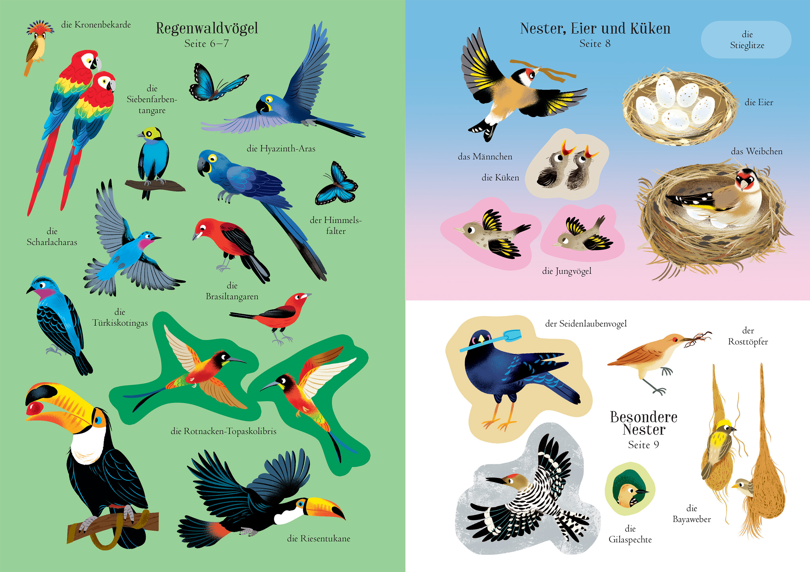 Lass Blaumeisen auf Futtersuche gehen, Papageien durch den Regenwald fliegen und eine Entenfamilie auf dem Teich schwimmen. Mit über 100 wiederablösbaren Stickern lernst du viele Vogelarten kennen und erfährst wissenswerte Fakten darüber, wie und wo sie leben.