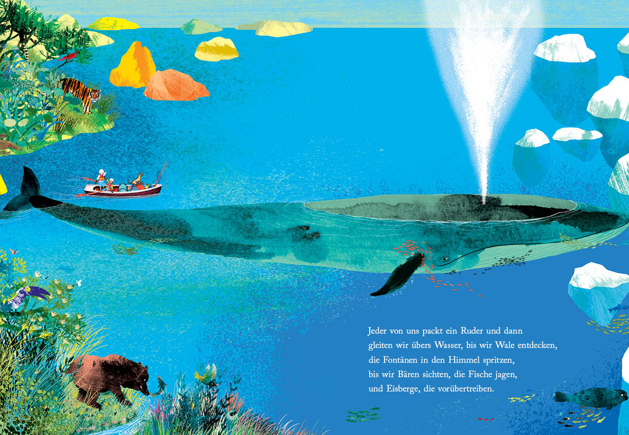 »Kleiner Bruder, du machst den ganzen Tag nichts anderes als Milch trinken und schlafen. Mama sagt, ich muss warten, bis du größer bist.« Und bis der kleine Bruder erst einmal größer ist, erzählt ihm der große Bruder, was sie dann alles gemeinsam unternehmen und erleben werden: gemeinsam mit ihren Fahrrädern durch den Dschungel fahren, die Ozeane bereisen und Wale sehen, in der Antarktis ein Feuer entzünden und im Sturm aufeinander achtgeben. Sie werden gemeinsam die Welt entdecken und dabei immer füreinander da sein.