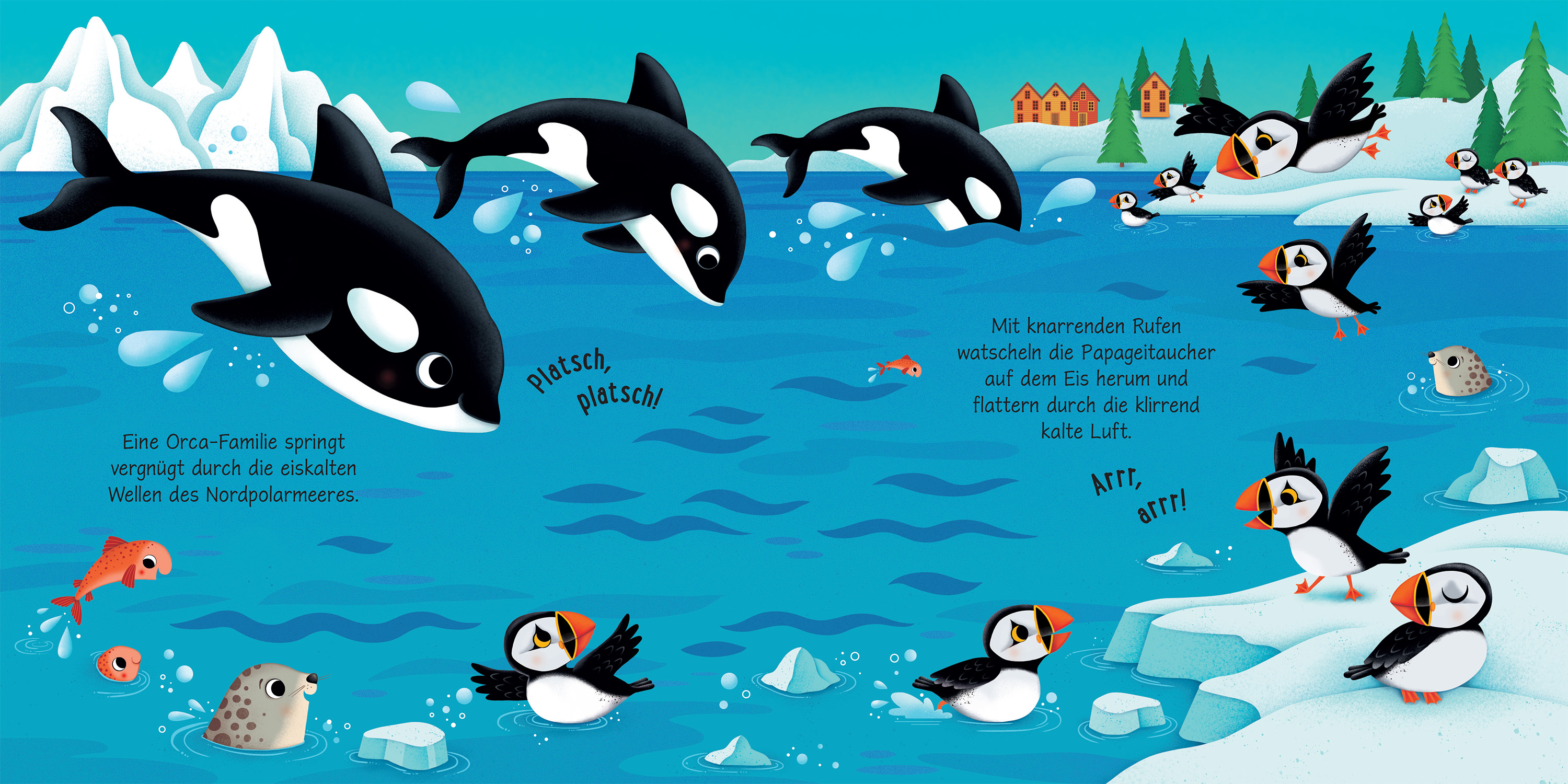Die Wale singen, die Schnee-Eule ruft und der kleine Eisbär übt sein Brüllen. Zehn echte Naturklänge machen Kinder mit den Geräuschen des eisigen Nordens vertraut. Mit einem integrierten Soundchip auf jeder Seite und praktischer Ein- und Ausschaltfunktion.