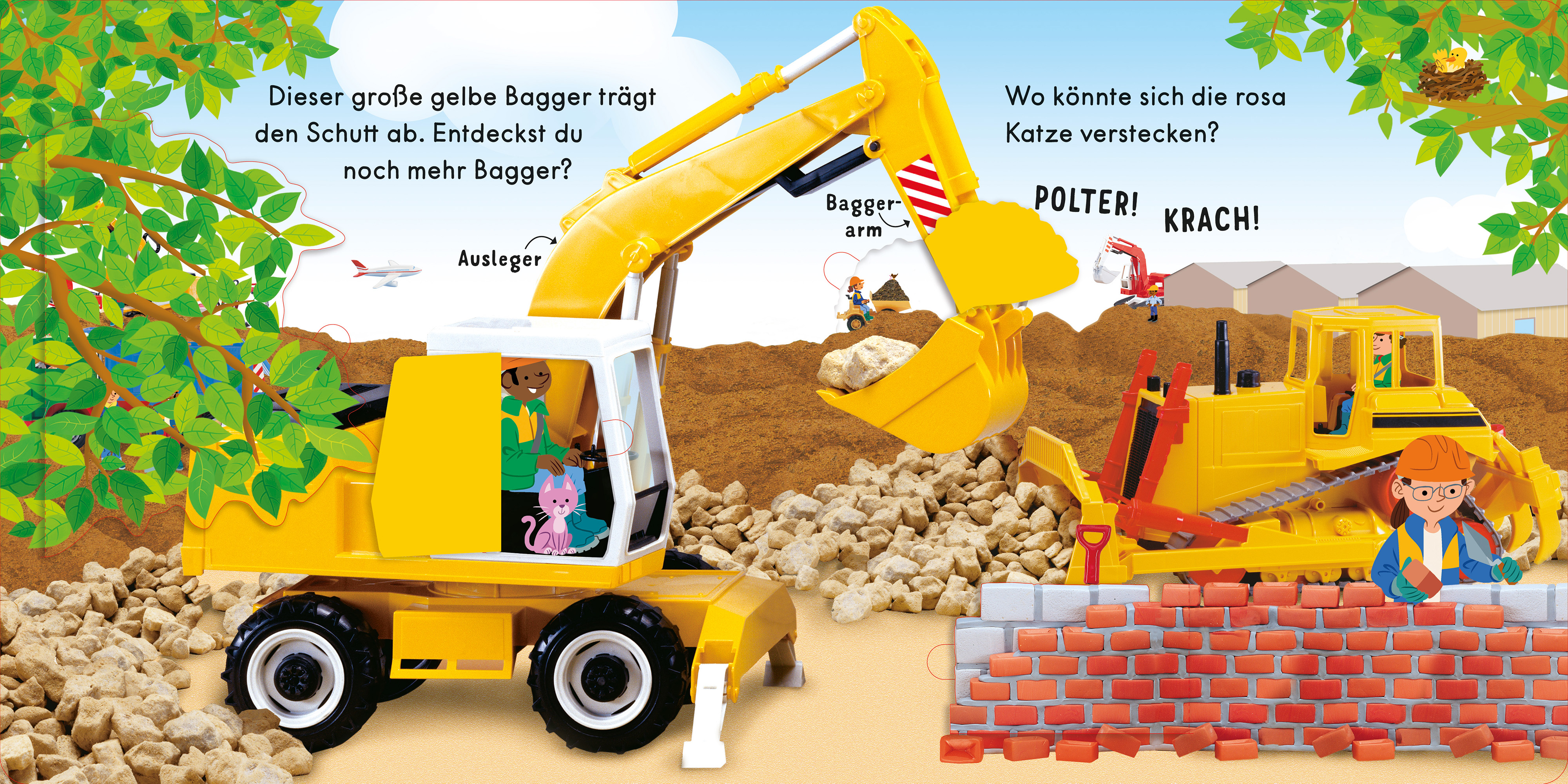 Schau unter die Klappen und finde heraus, was Bagger alles können: riesige Steine umschichten, bei Straßenarbeiten ein großes Loch ausheben, das Fundament für ein neues Haus legen und noch viel mehr! Auf jeder Seite versteckt sich eine kleine rosafarbene Katze - findest du sie?