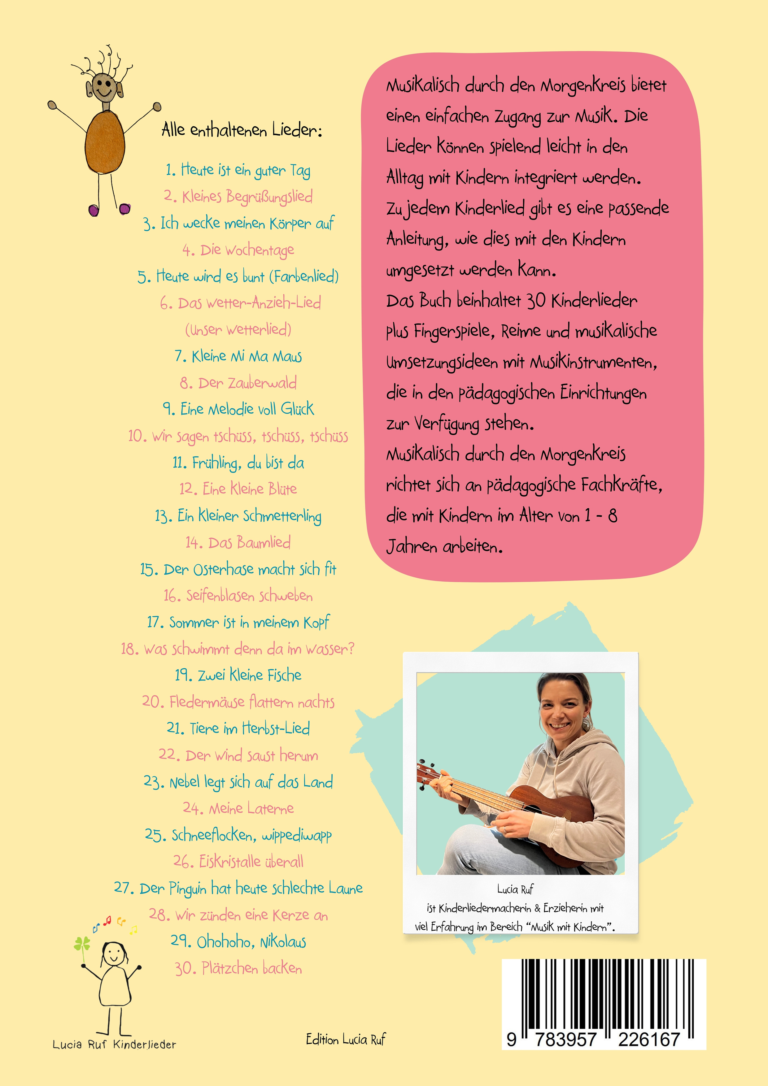 BUCH MIT CD - Lucia Ruf: Musikalisch durch den Morgenkreis (30 Kinderlieder für die Krippe & Kita). Das Buch beinhaltet 30 Kinderlieder plus Fingerspiele, Reime und musikalische Umsetzungsideen mit Musikinstrumenten, die in den pädagogischen Einrichtungen zur Verfügung stehen. Musikalisch durch den Morgenkreis richtet sich an pädagogische Fachkräfte, die mit Kindern im Alter von 1 - 8 Jahren arbeiten. Das erwartet dich in diesem Buch! In diesem Buch versammeln sich 30 neue Kinderlieder sowie Spiel- und kreative Gestaltungsideen für einen musikalsichen Impuls oder den Morgenkreis. Du findest Lieder zu den Jahreszeiten (Frühling, Sommer, Herbst & Winter) sowie Lieder für jeden Tag oder für besondere Anlässe in der Krippe, der Kita, dem Kindergarten und der Grundschule. Musik mit Kindern kann in allen Bildungsbereichen stattfinden. Damit dies einfach gelingt, findest du in diesem Buch eine große Auswahl an Kinderliedern und viele Gestaltungsideen, die du ohne großen Aufwand und spielend leicht mit den Kindern umsetzen kannst. Inklusive einer CD. Musikalisch durch den Morgenkreis bietet einen einfachen Zugang zur Musik. Die Lieder können spielend leicht in den Alltag mit Kindern integriert werden. Zu jedem Kinderlied gibt es eine passende Anleitung, wie dies mit den Kindern umgesetzt werden kann. Alle enthaltenen Lieder: 1. Heute ist ein guter Tag 2. Kleines Begrüßungslied 3. Ich wecke meinen Körper auf 4. Die Wochentage 5. Heute wird es bunt (Farbenlied) 6. Das Wetter-Anzieh-Lied (Unser Wetterlied) 7. Kleine Mi Ma Maus 8. Der Zauberwald 9. Eine Melodie voll Glück 10. Wir sagen tschüss, tschüss, tschüss 11. Frühling, du bist da 12. Eine kleine Blüte 13. Ein kleiner Schmetterling 14. Das Baumlied 15. Der Osterhase macht sich fit 16. Seifenblasen schweben 17. Sommer ist in meinem Kopf 18. Was schwimmt denn da im Wasser? 19. Zwei kleine Fische 20. Fledermäuse flattern nachts 21. Tiere im Herbst-Lied 22. Der Wind saust herum 23. Nebel legt sich auf das Land 24. Meine Laterne 25. Schneeflocken, wippediwapp 26. Eiskristalle überall 27. Der Pinguin hat heute schlechte Laune 28. Wir zünden eine Kerze an 29. Ohohoho, Nikolaus 30. Plätzchen backen