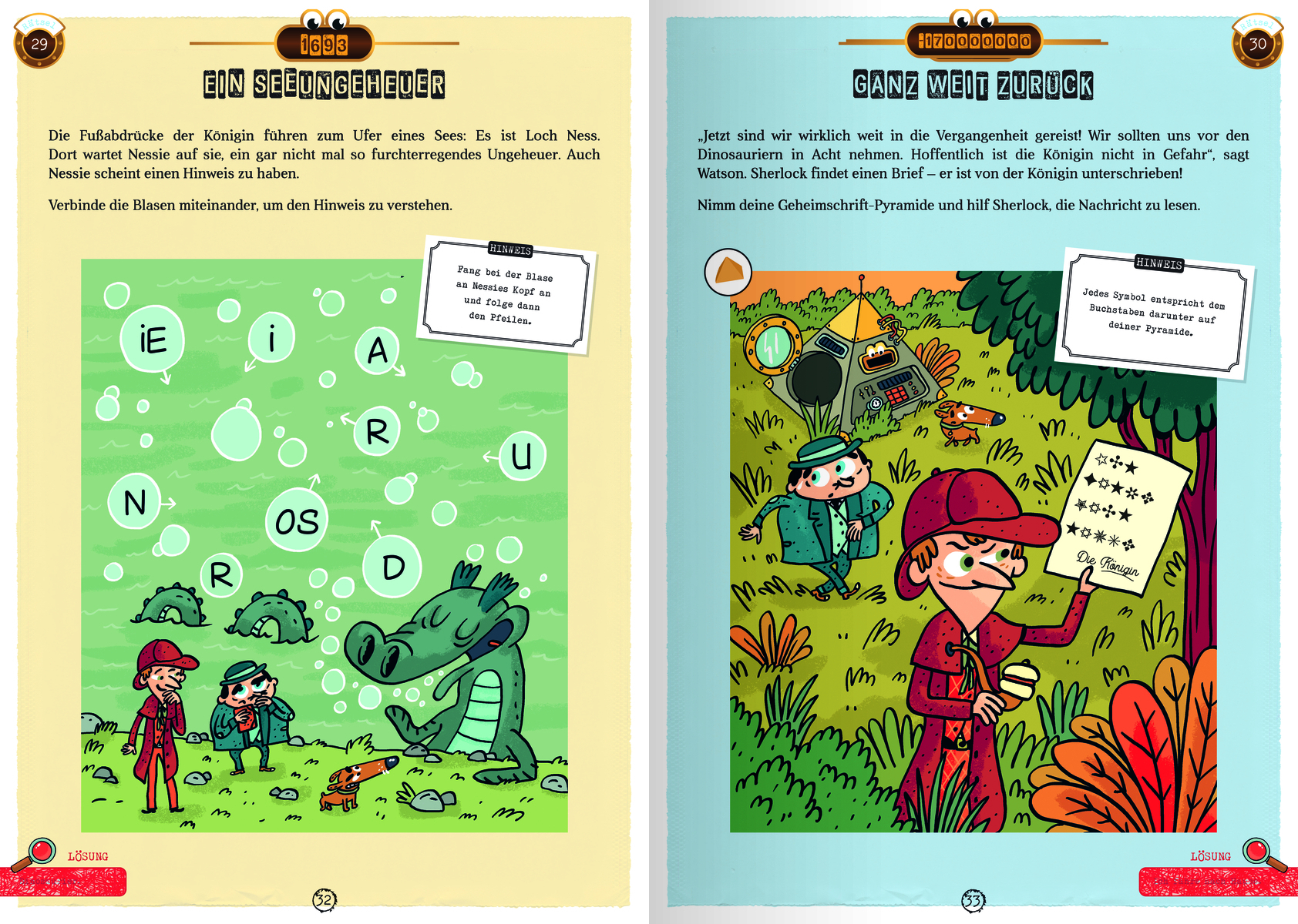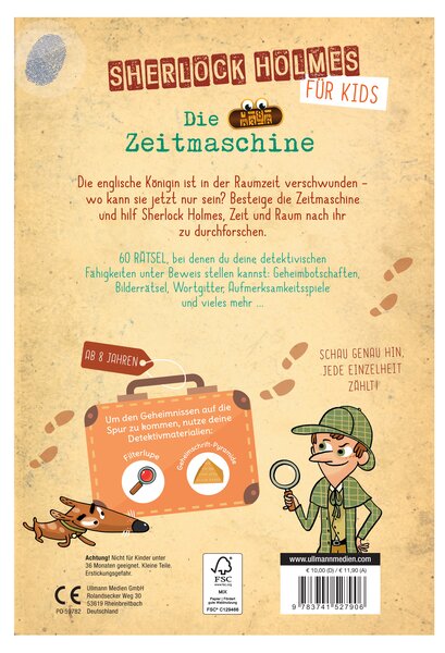 In diesem Rätselbuch für Kinder ab 8 Jahren sind die kleinen Detektive zusammen mit Sherlock Holmes und Dr. Watson auf einer geheimnisvollen Spur. 60mal führen spannende Rätselfragen, Suchbilder, Buchstabenrätsel und Knobelaufgaben Schritt für Schritt zur Lösung des Falles. Die englische Königin ist in der Raumzeit verschwunden - wo kann sie jetzt nur sein? Im Zeitalter Elisabeths I.? In der Steinzeit? Oder doch im alten Ägypten? Gut, dass Sherlock Holmes eine Zeitmaschine aufgetrieben hat und die Verfolgung aufnehmen kann! Hilf Sherlock Holmes dabei, Zeit und Raum nach der Königin zu durchforschen.60 Rätsel, bei denen der junge Leser deine detektivischen Fähigkeiten unter Beweis stellen kann: Geheimbotschaften, Bilderrätsel, Wortgitter, Aufmerksamkeitsspiele und vieles mehr. Wer alle Rätsel nacheinander löst, kann den Fall aufklären und die Königin zurückholen. Mit Decodier-Pyramide und Lösungslupe mit roter Folie zum Überprüfen, ob man richtig liegt!Mach dich geneinsam mit Sherlock und seinen Freunden auf die Suche nach der Königin und erlebe spannende Rätselabenteuer quer durch Zeit und Raum!-60 Rätsel: Geheimbotschaften, Logikrätsel, Suchbilder, Codes und vieles mehr-Inklusive magischer Lupe und Decodier-Pyramide-Mit Hinweisen und Lösungen