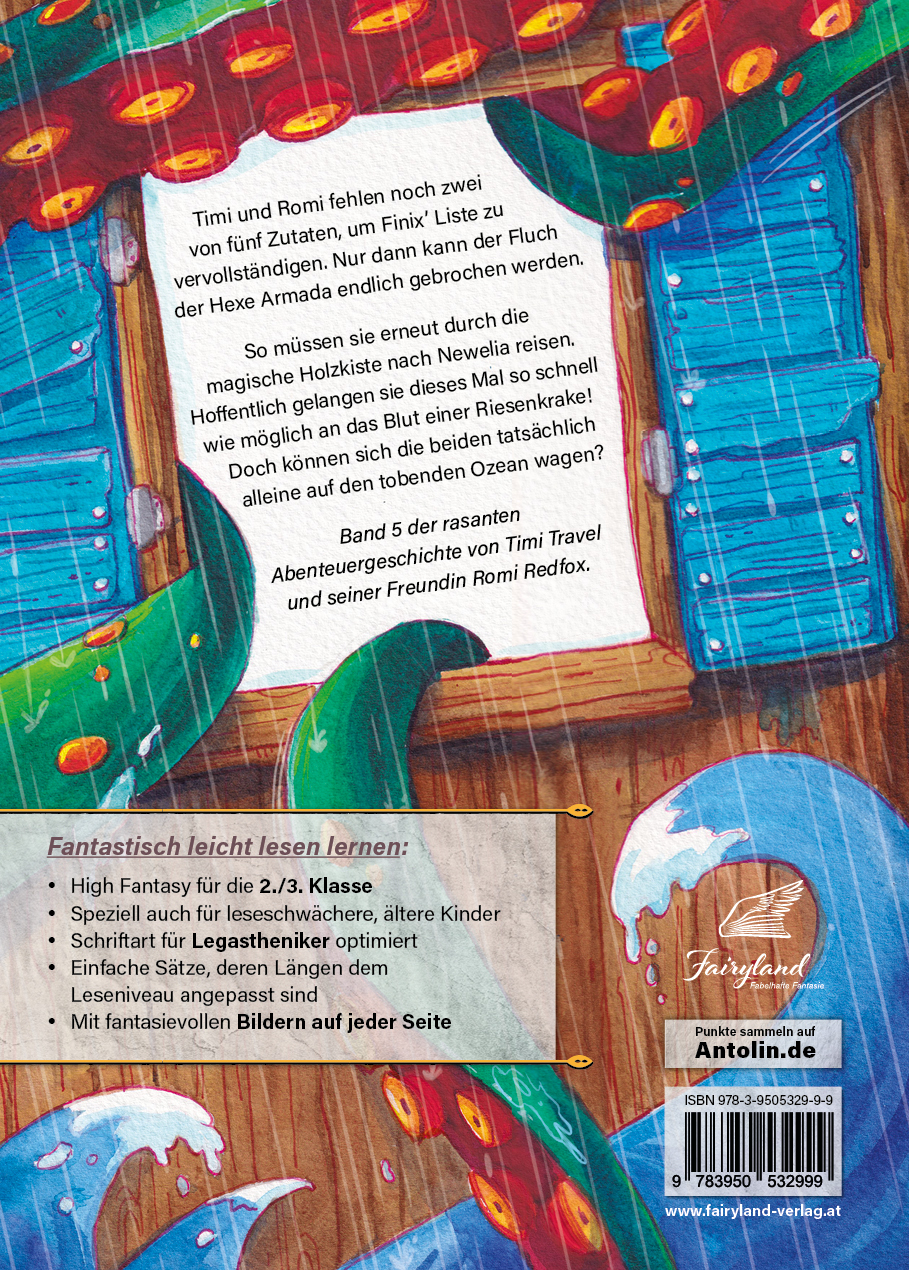 Timi und Romi konnten bereits drei Zutaten besorgen. Jedoch liegen noch zwei Abenteuer vor ihnen um alle Gegenstände auf Finix´ Liste zu erhalten. Nur dann kann der Fluch der Hexe Amarda endlich gebrochen werden.So müssen sie erneut mit Hilfe der magischen Holzkiste nach Newelia reisen. Hoffentlich gelangen sie dieses Mal so rasch wie möglich an das Blut einer Riesenkrake. Doch können sich die beiden tatsächlich alleine auf den tobenden Ozean wagen?